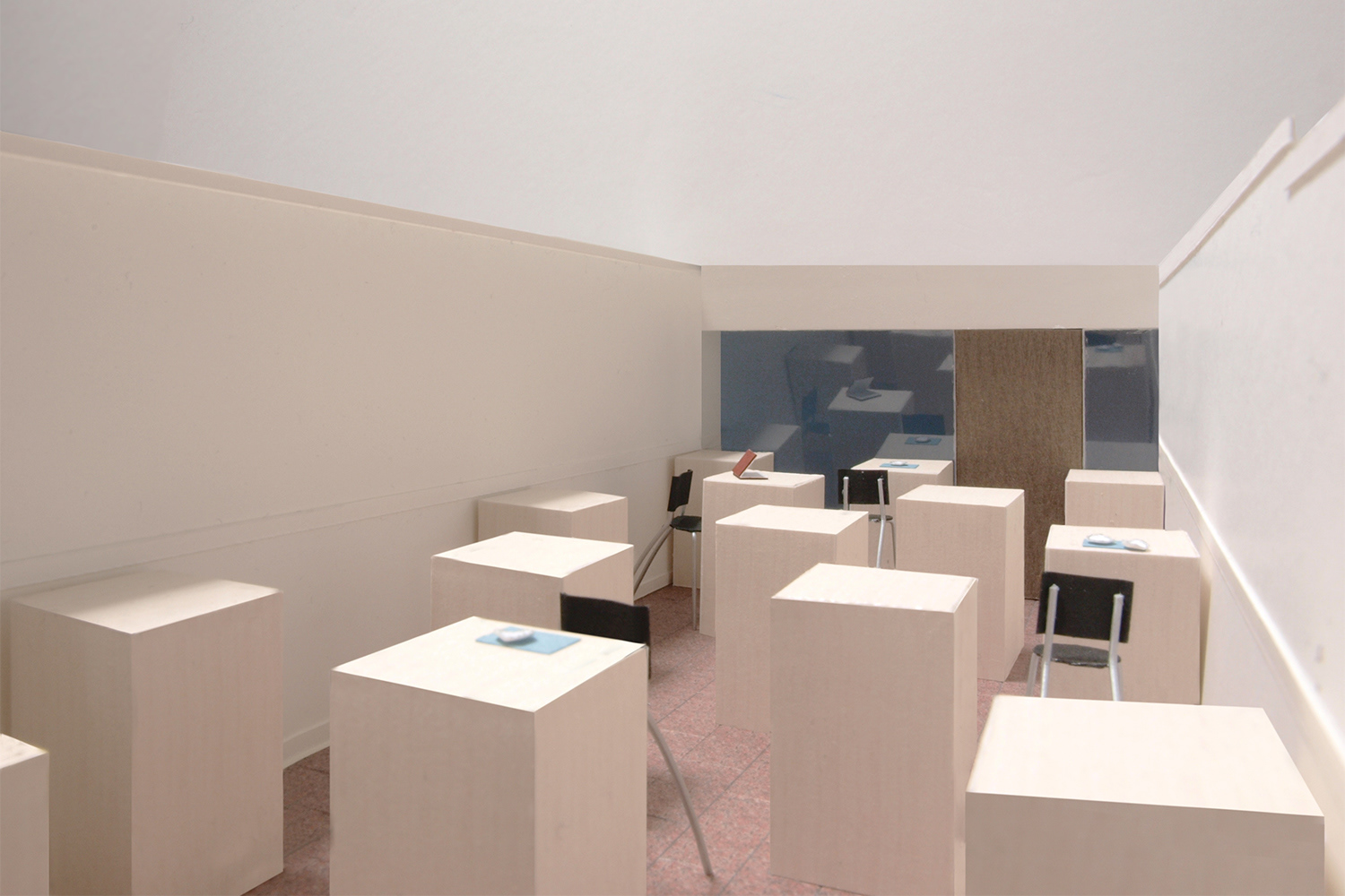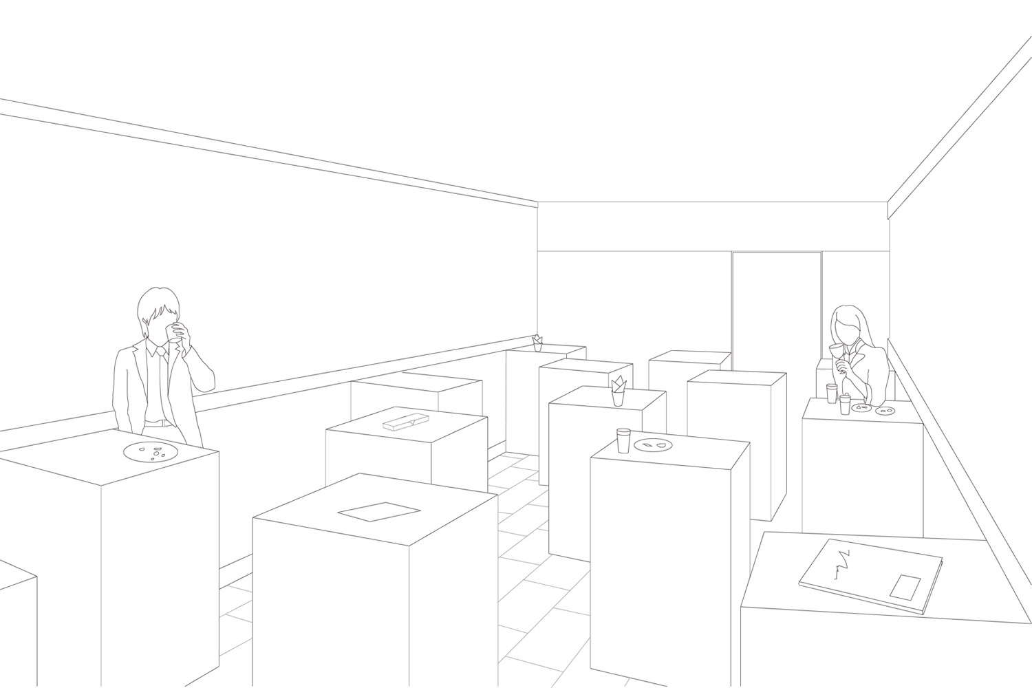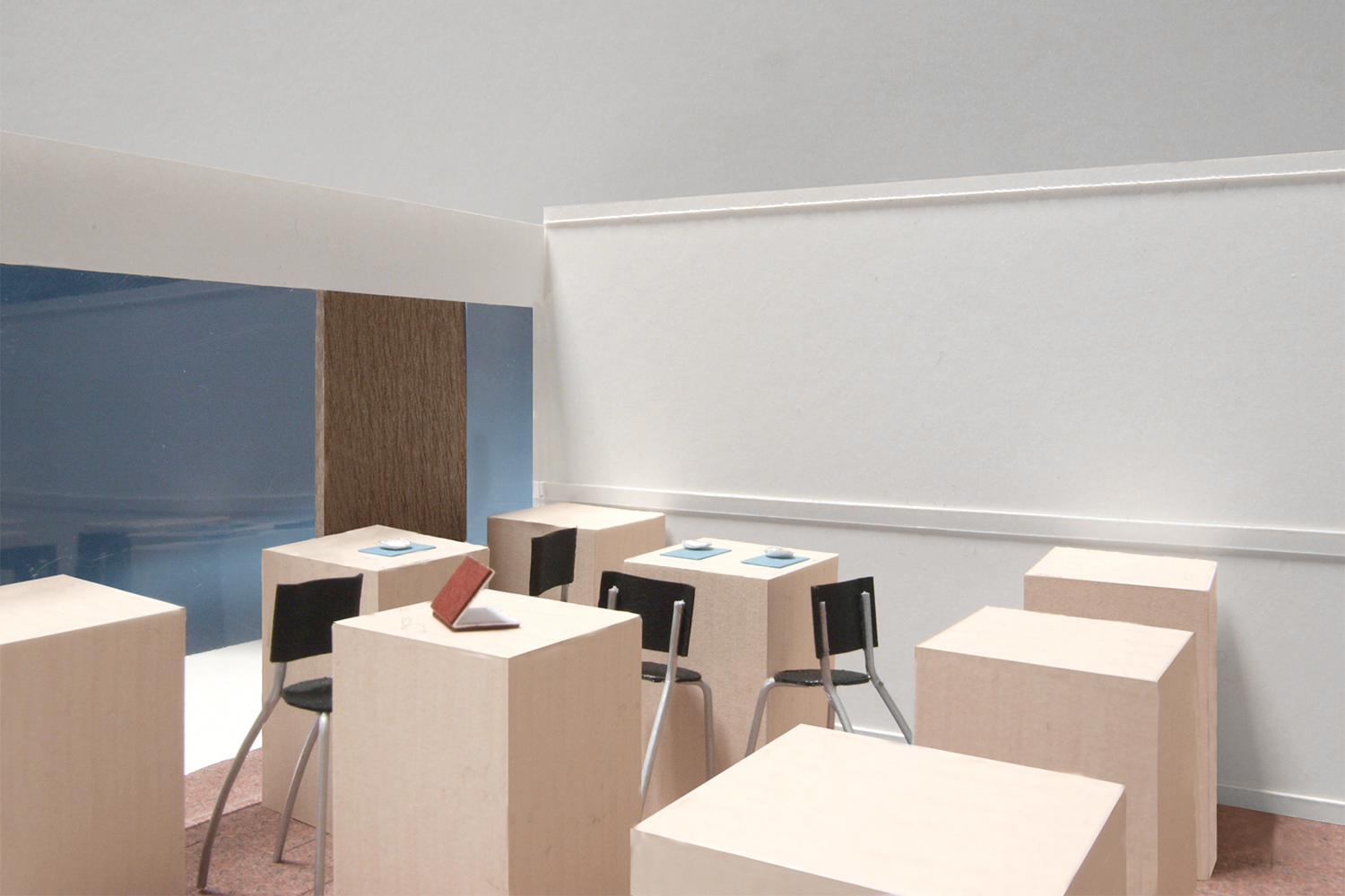 そこで私達は、それら椅子がすっかり納まるボックス型のテーブル15台で構成された空間を提案した。