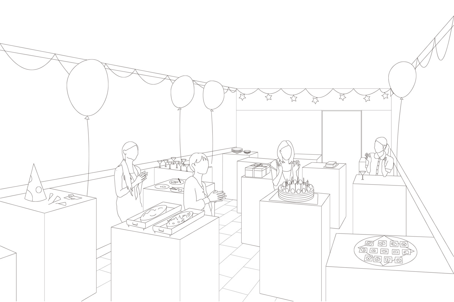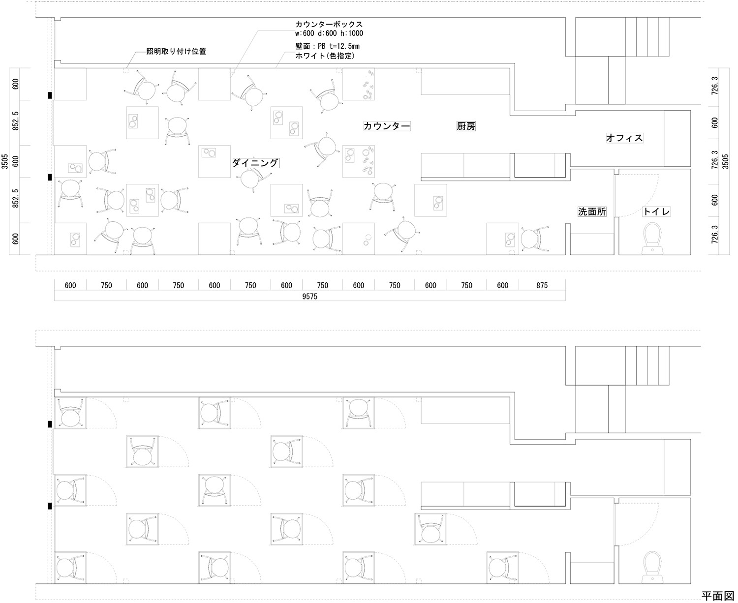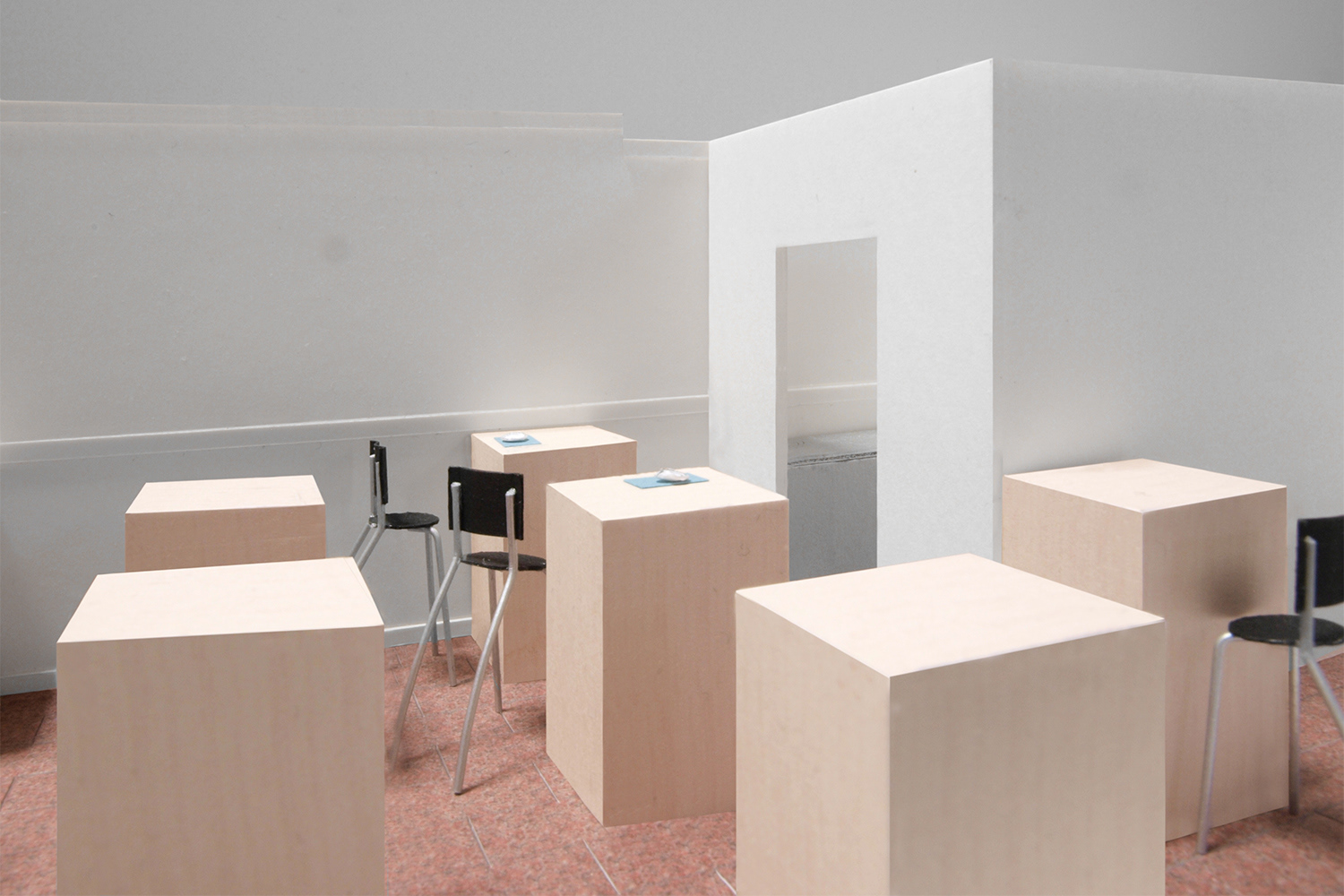 そこで私達は、それら椅子がすっかり納まるボックス型のテーブル15台で構成された空間を提案した。