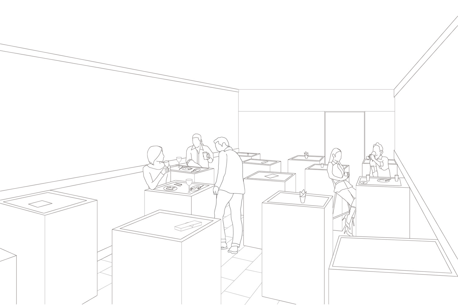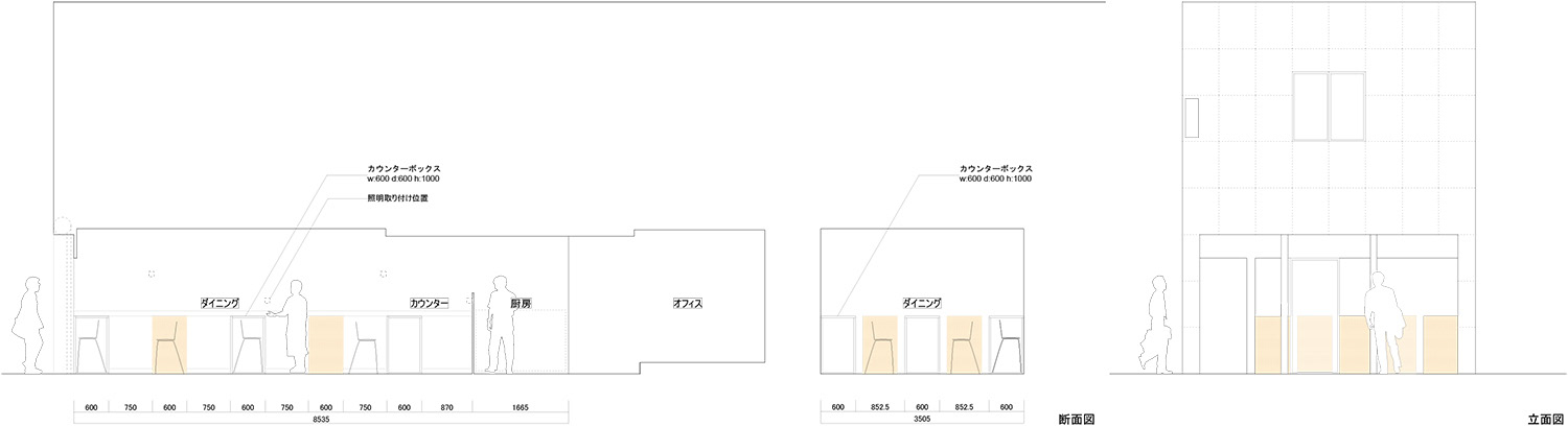 立食スタイル・3~4人ほどのグループでの食事・一人で過ごす時間・パーティーなど・・・様々な状況に応え、客同士はもちろん、マスターと客の間での様々なコミュニケーションを支援するような建築を目指した。