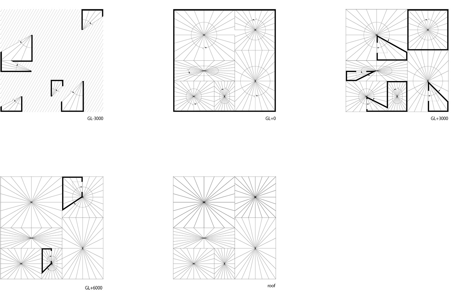 私達は、巨大な『階段』をモチーフに、床・壁・天井がすべて一体的に扱われた、住宅の原型を提案した。巨大な階段は、動線という既存の役割を越え、座る事はもちろん、寝転がったり、談笑したり出来る場所として機能しはじめる。地中深く潜り込む階段。合流し合う階段。内部と外部を繋げ、境界を曖昧にする階段・・・階段がもたらす空間のグラデーションの中で、居住者自身が、その時々の場面に応じて最も居心地の良い空間を選び取れるような建築を目指した。