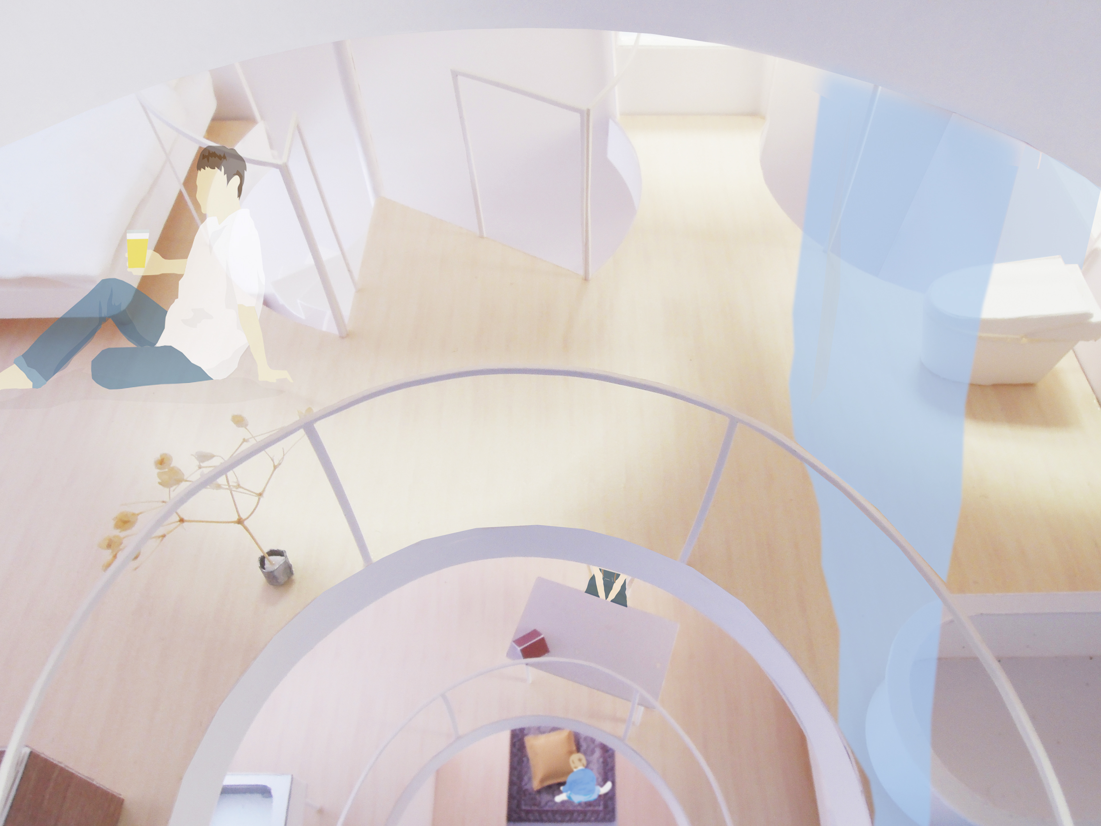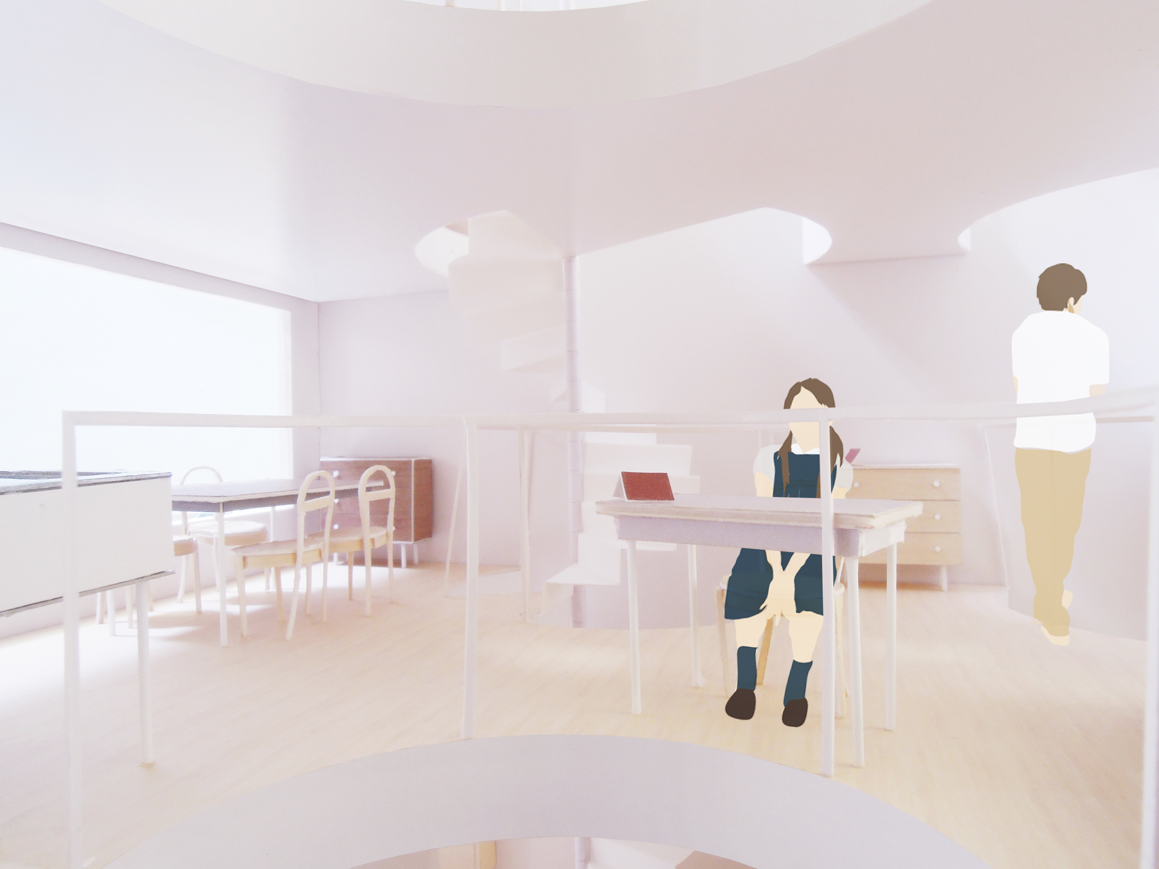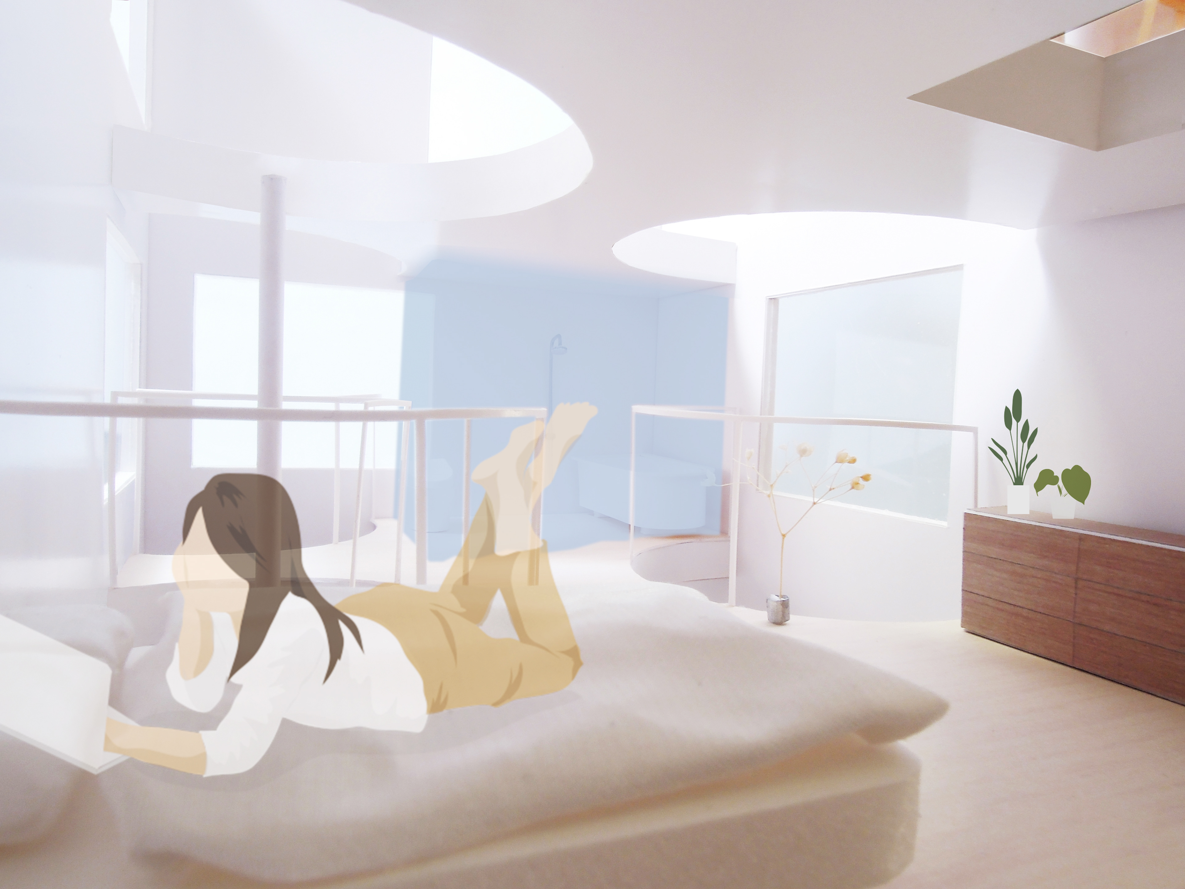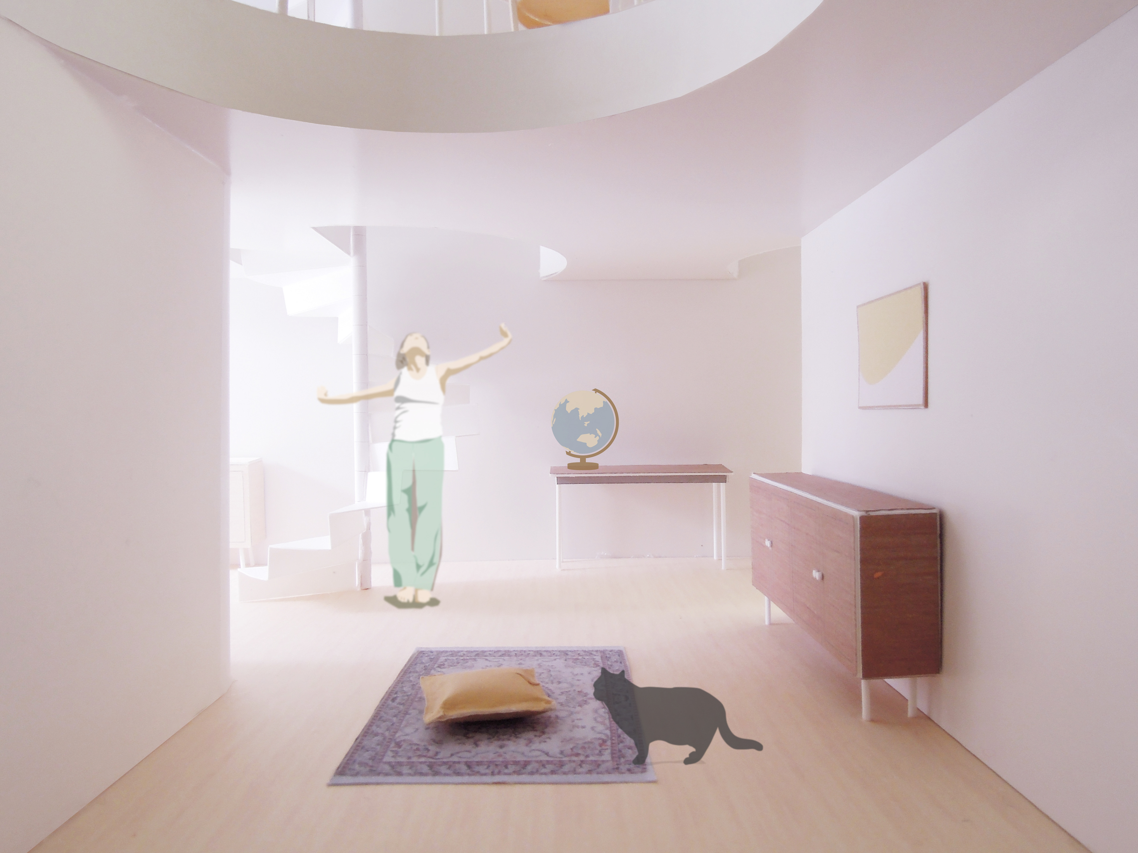 提案を通して、私たちは、その二つの課題を、ポジティブな要素に還元できるのではないかと思い、この【吹抜けでつくるワンルーム】を提案した。