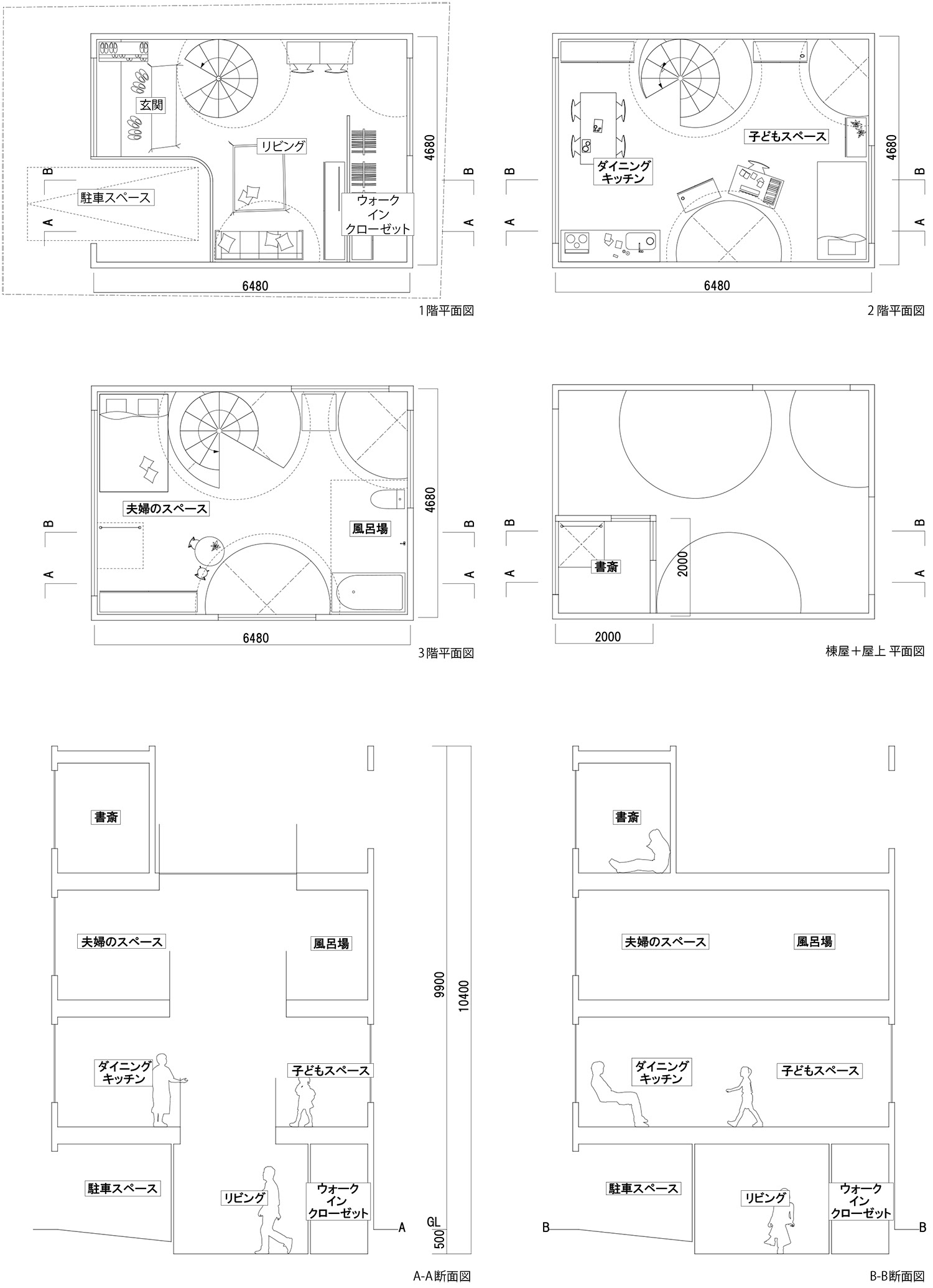 041_ex_Iさんへの住宅案 _【吹抜けでつくるワンルーム】 所在地 : 東京都中野区 主用途 : 個人住宅 規模等 : 鉄骨造 76㎡ 地上3階建+塔屋 設計期間 : 2012年6月 ~ 2012年8月 意匠 : 菊池甫