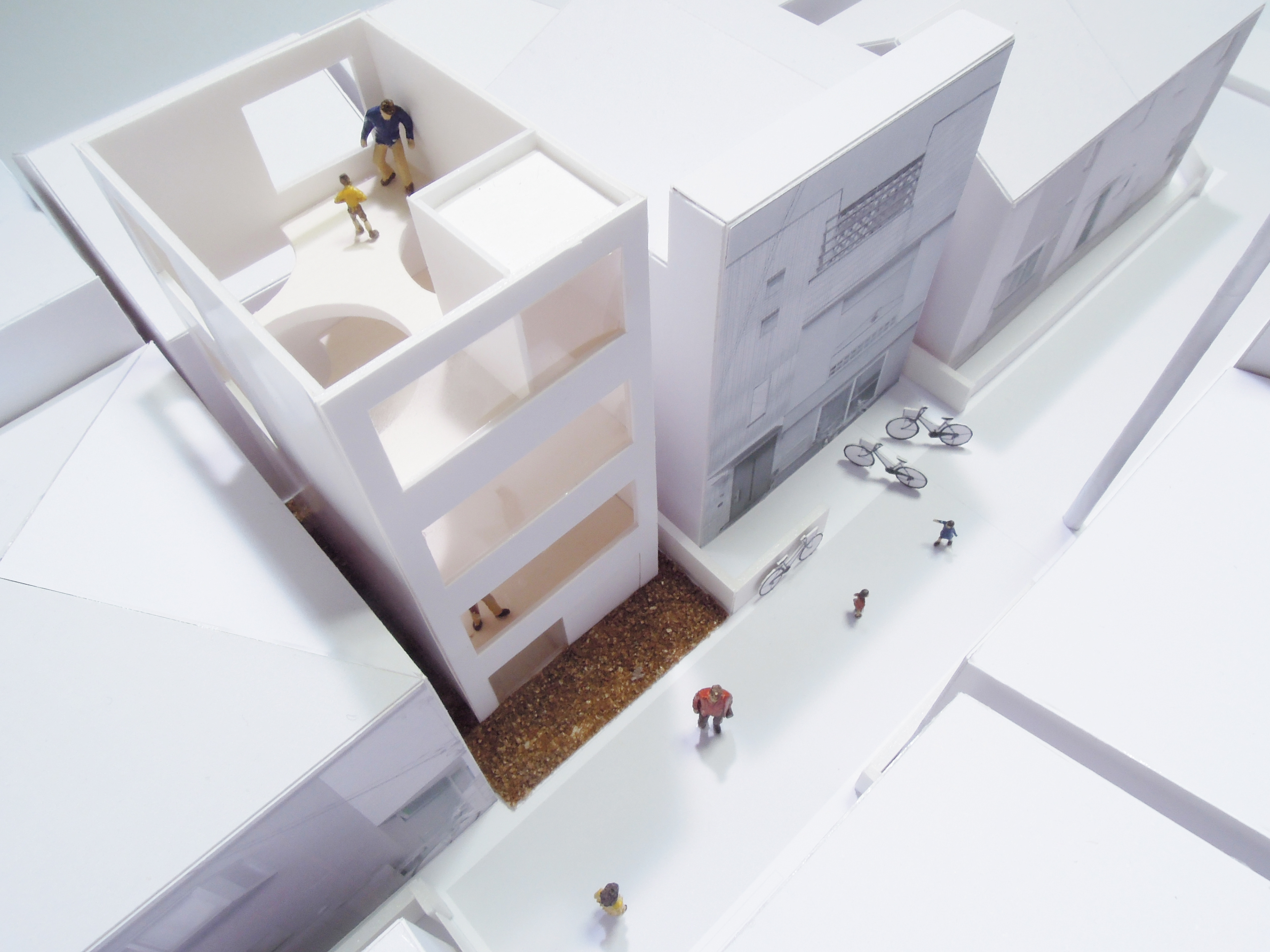 提案した建築は、内部に複数の大きな吹抜けを持つ3階建の住宅で、路地に面する北側の立面には、大きな開口が開けられている。