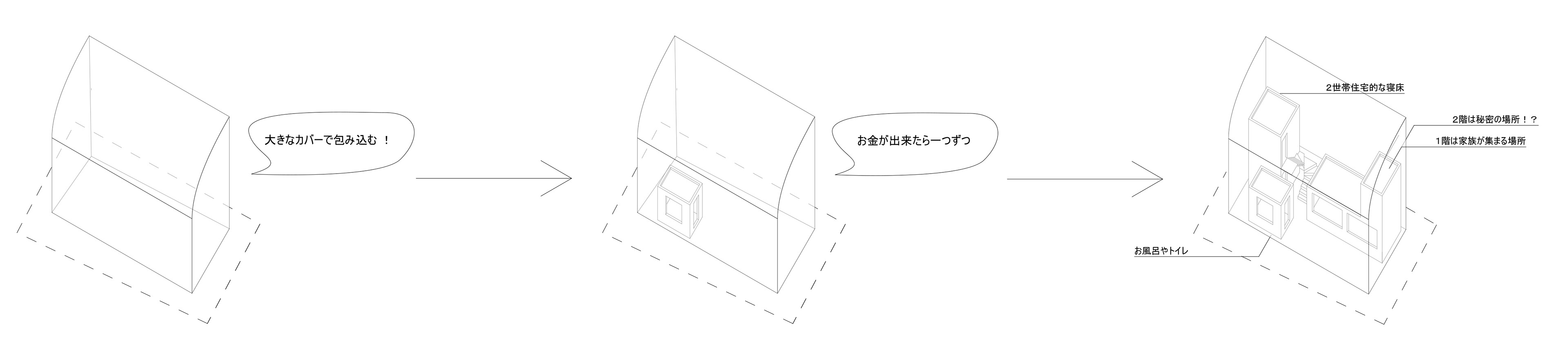 そこで私達は、郊外の、非常に安価に購入できる土地に目を付け、まずは最低限の居住環境のみを建設し、後に随時増設できる仕組みを検討した。