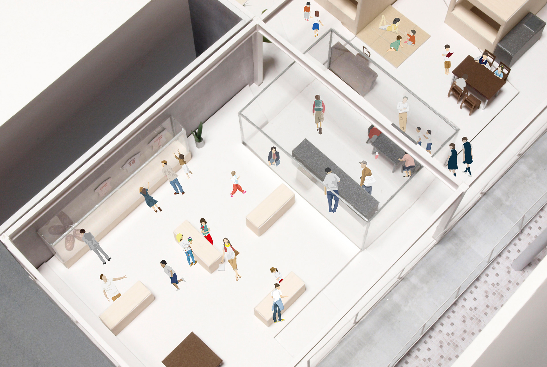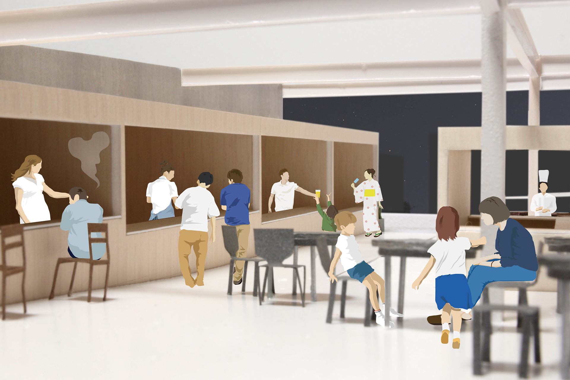 また、オープンスペースの各所には、必要な機能を、外部店舗から延長した屋台のように配置し、利用者が商店街から自然にアクセスできる構成としました。