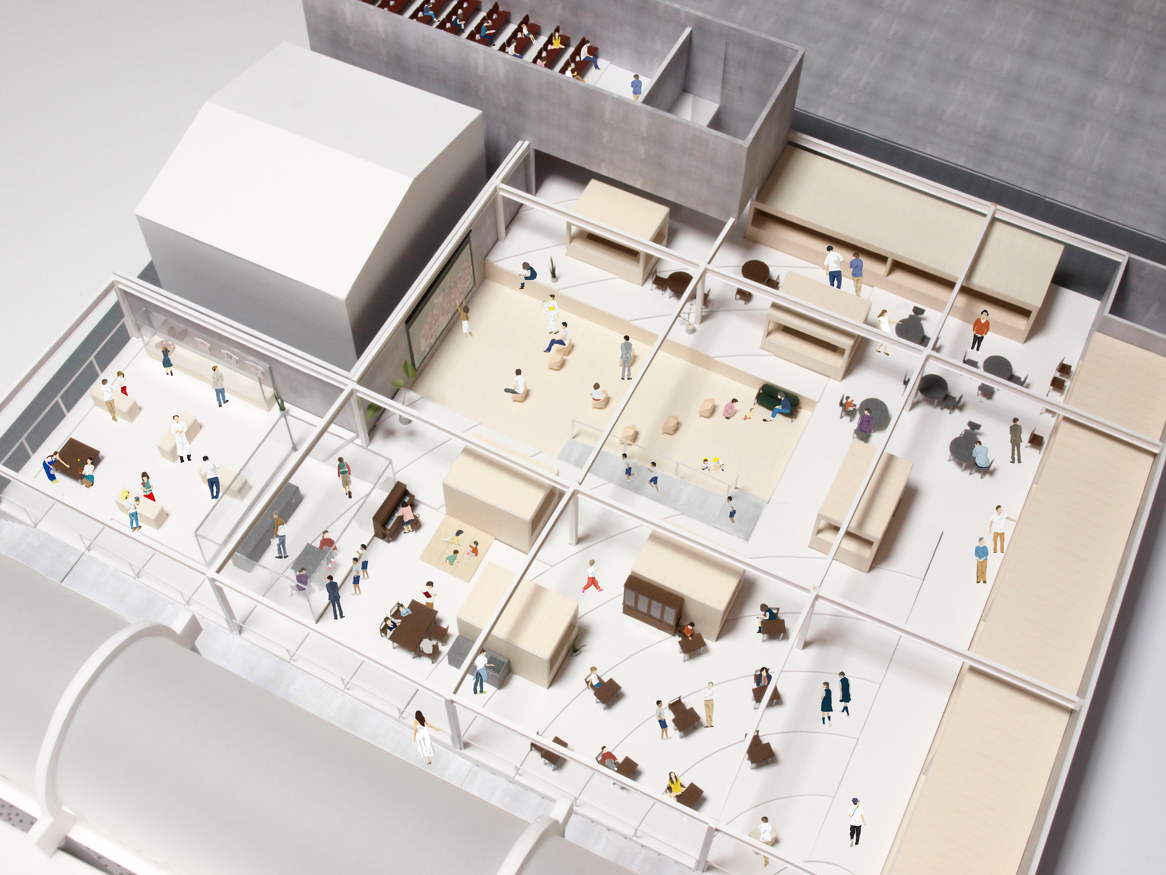 そこで、建築全体が舞台にも客席にも使えるような、緩やかな段差のオープンスペースで構成された、巨大な一室空間を提案しました。