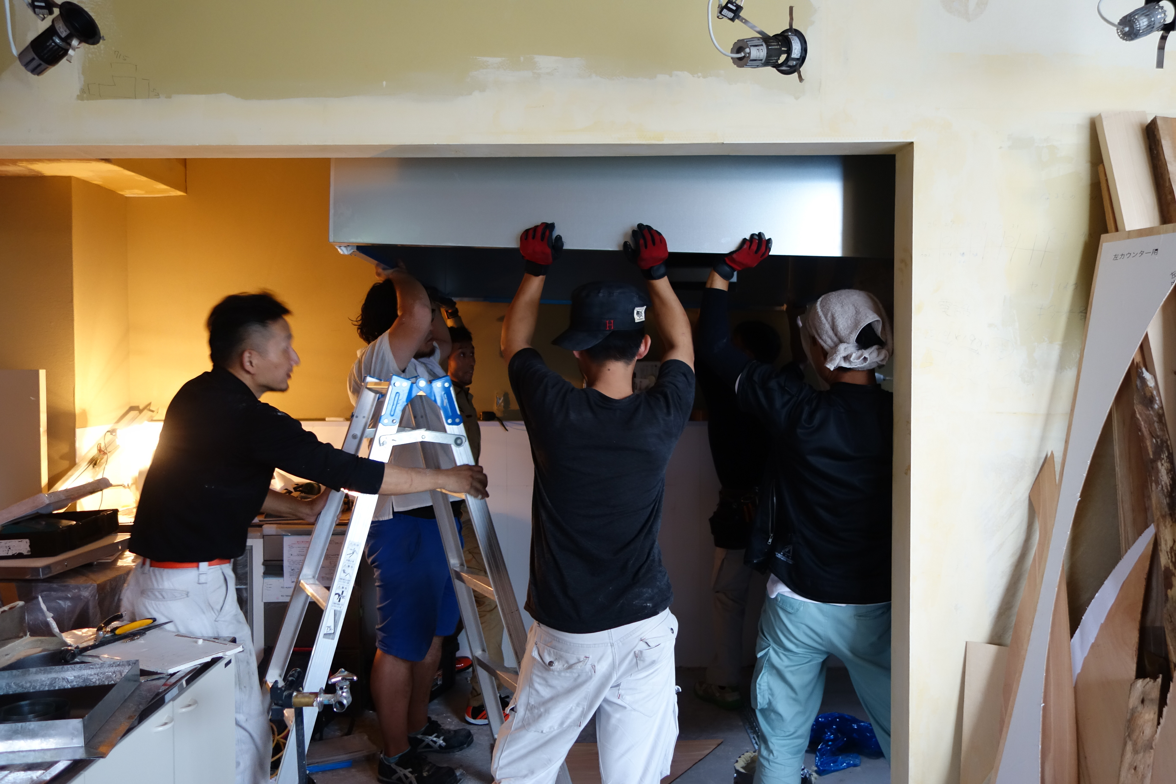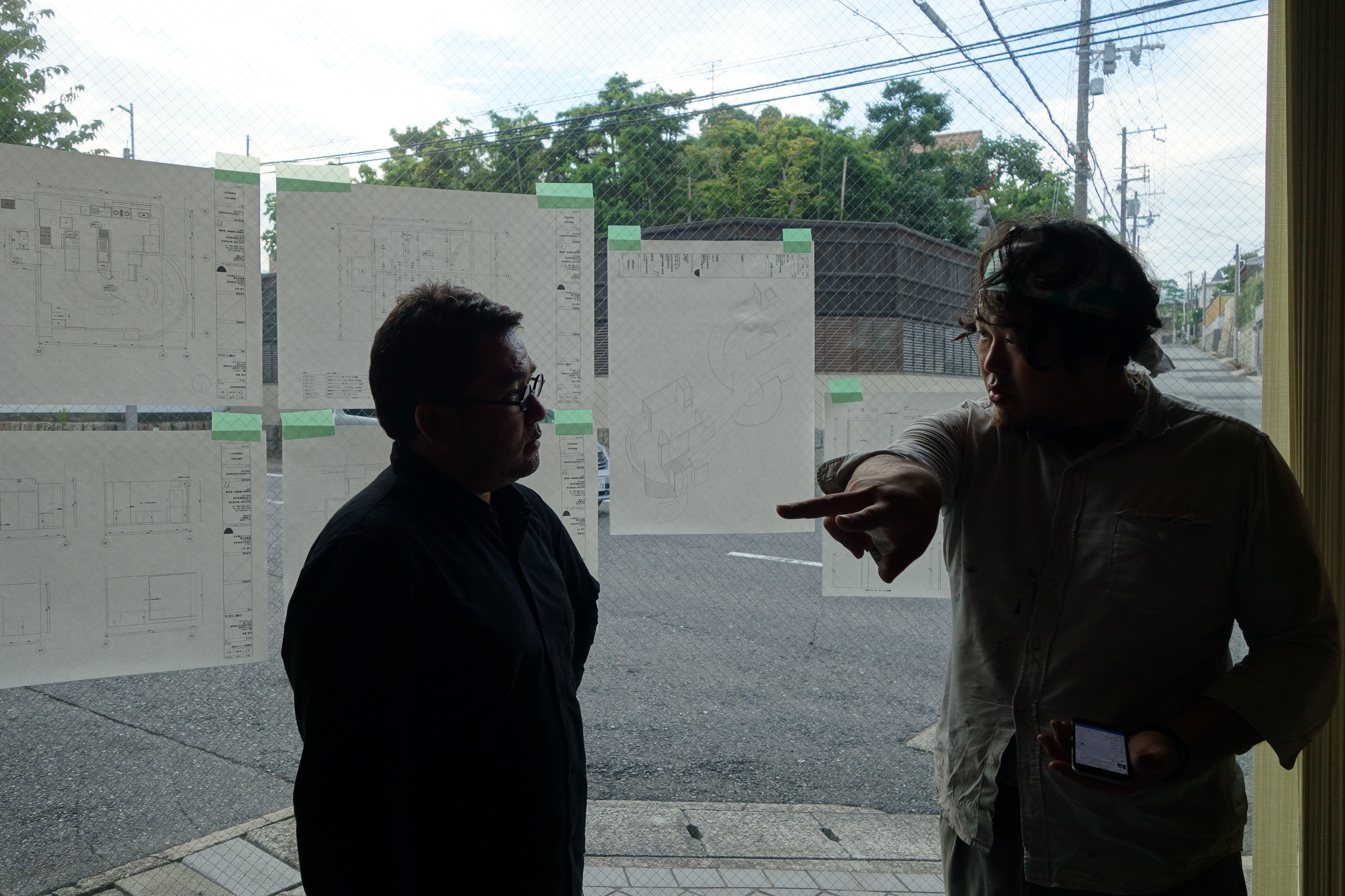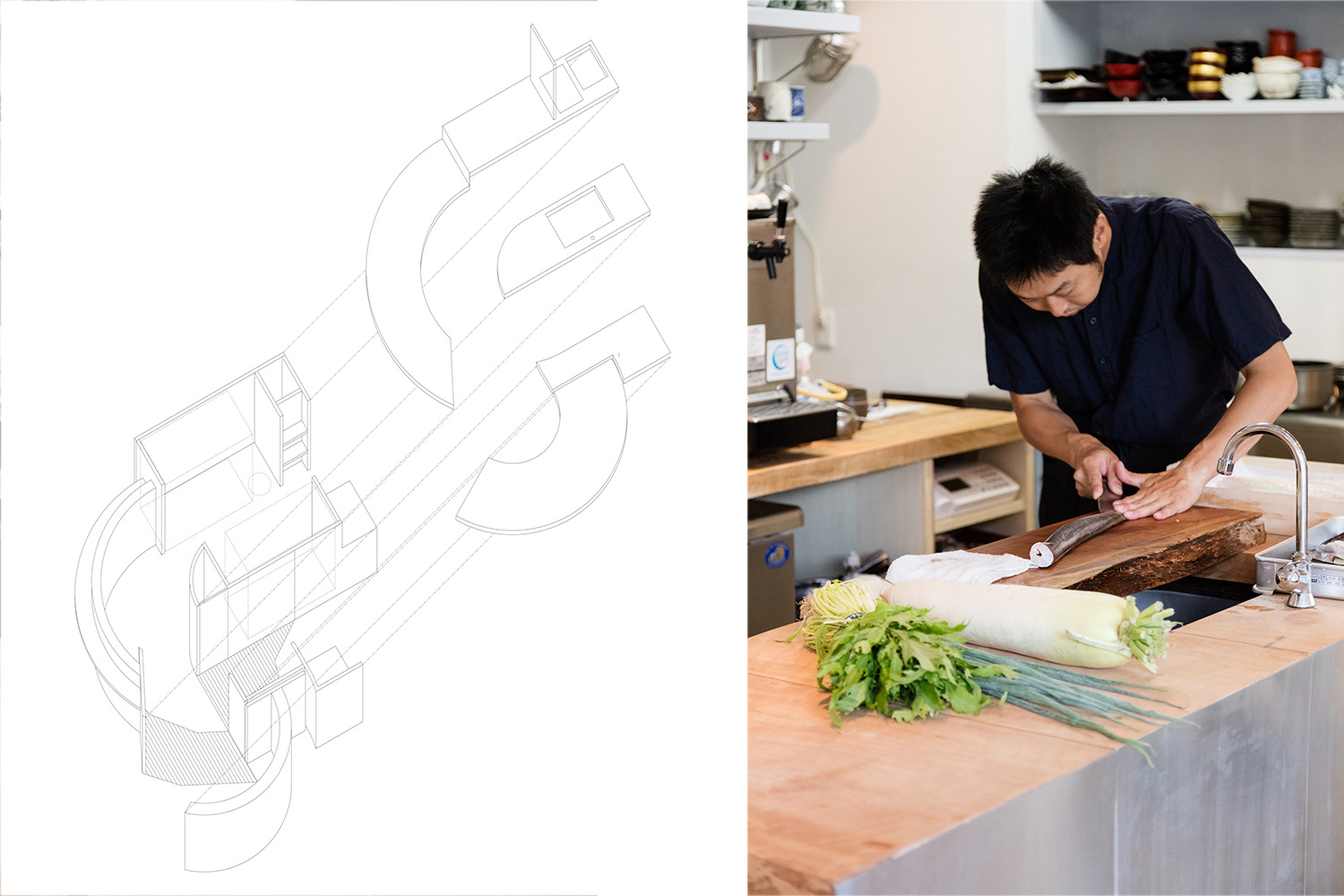 風車が、そこにある空気を心地よく撹拌するように、風車型の木製家具によって、両者の振る舞いが混ざりあい、影響し合い、より豊かで刺激的な時間をつくり出せればと考えました。そして料理人と客の豊かなやりとりを、西側の開口が、風景として西宮の町に映し出します。店と町の双方にとって価値のある、豊かなふるまいを作り出す。そんなふるまいをつくることが、この場所に根付くきっかけをも作ってくれるのではないかと、私達は考えました。