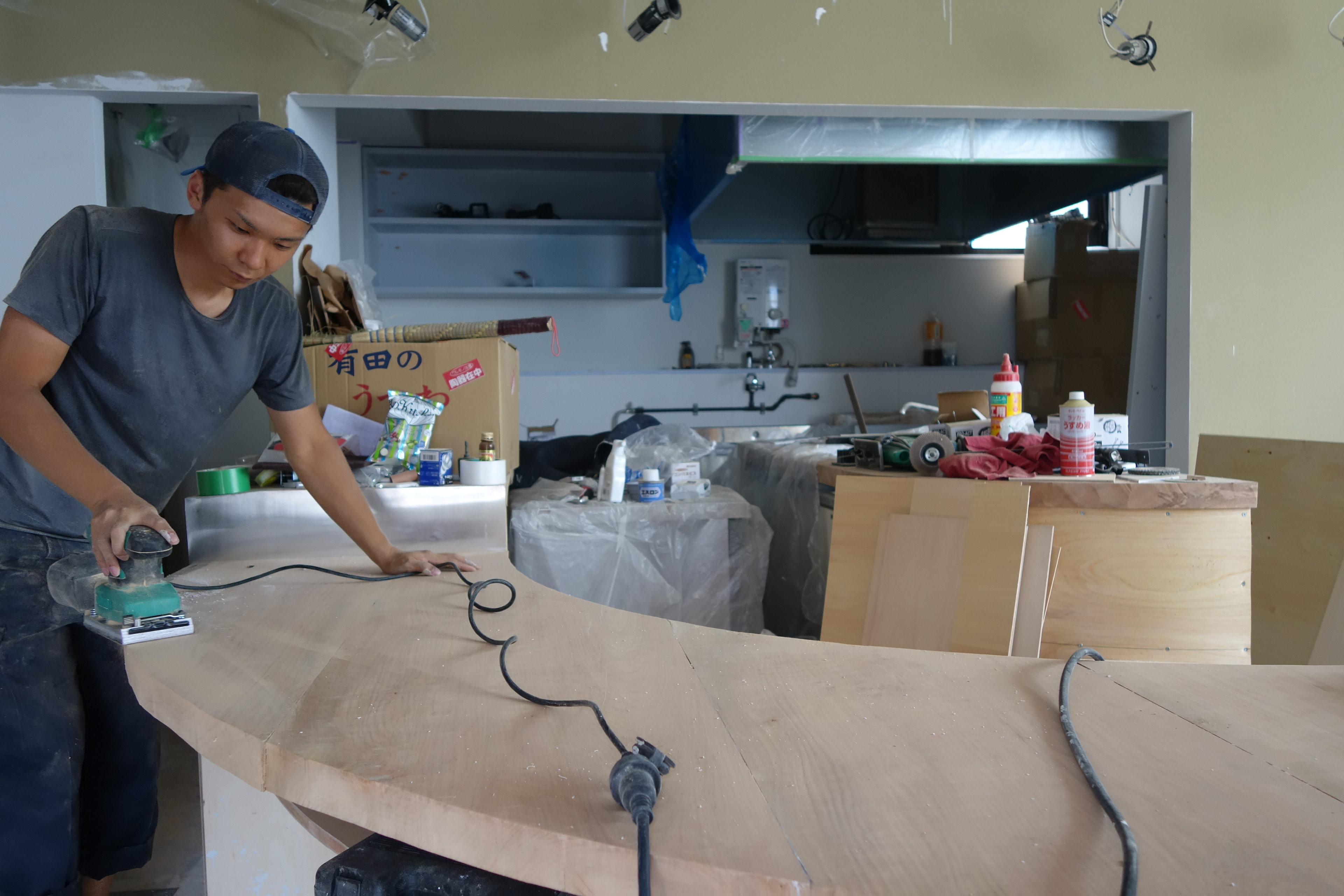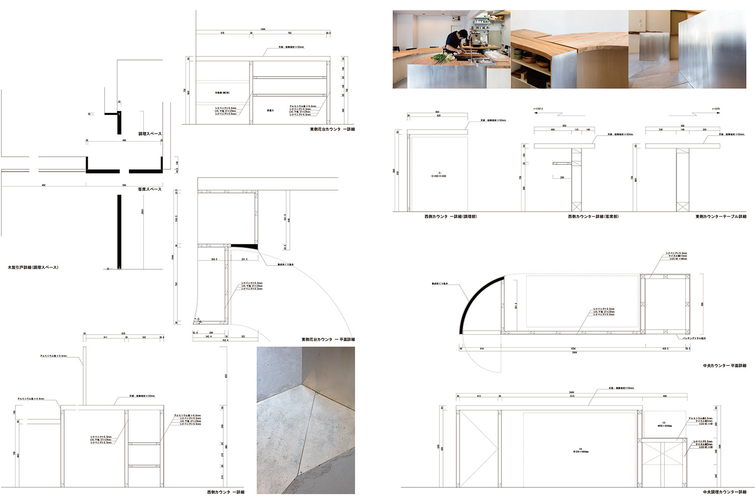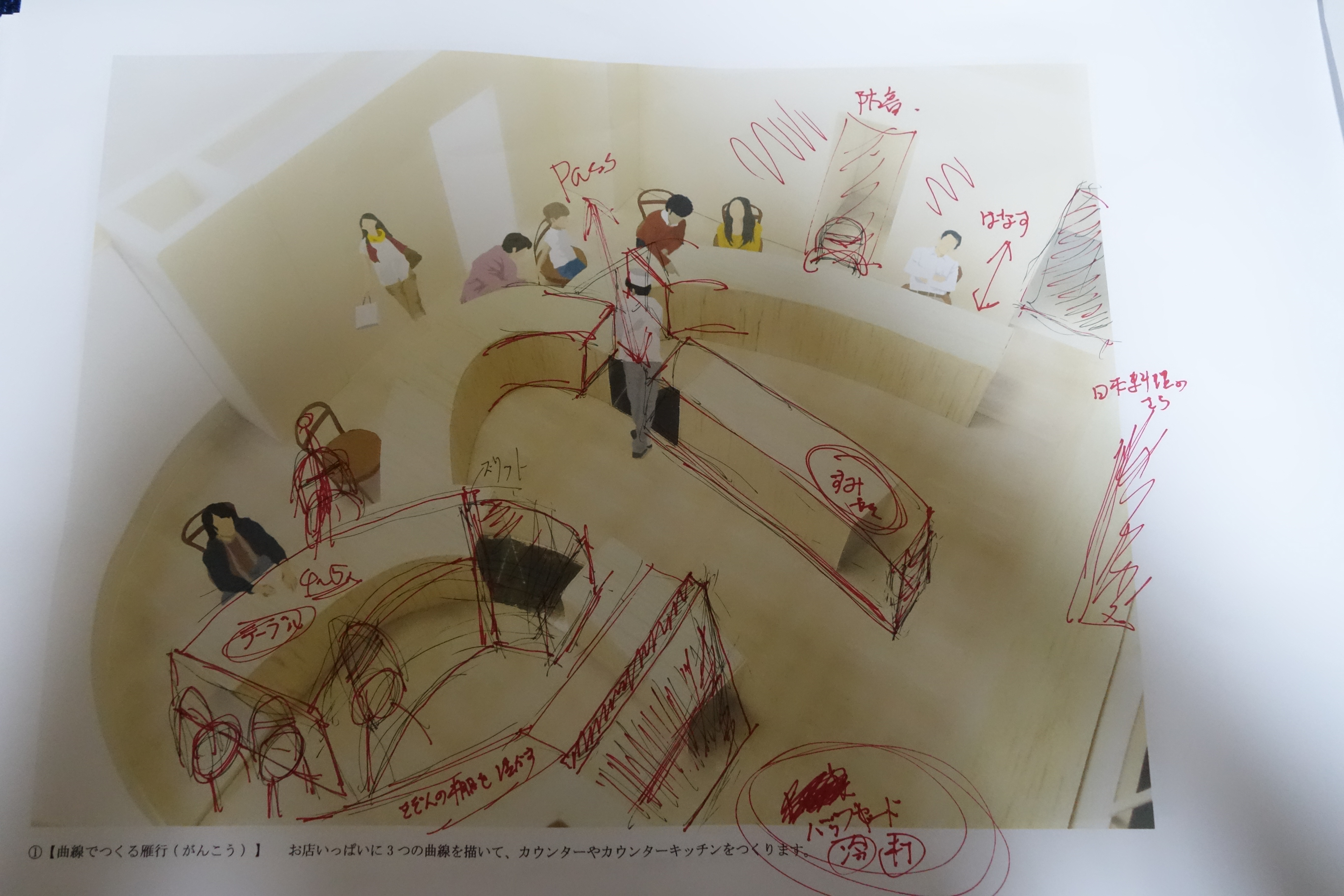 建築は、明確にゾーニングされた客席スペースと調理スペースの2つの空間で構成されていて、両空間をまたぐように風車型の大きな木製家具が配置されています。料理人と客は、この風車型の家具に沿うように行動しながら、料理を調理または味わい、会話を楽しみます。客と料理人の双方が主体的に振る舞える空間を作ることが、今回の提案、一番の狙いです。