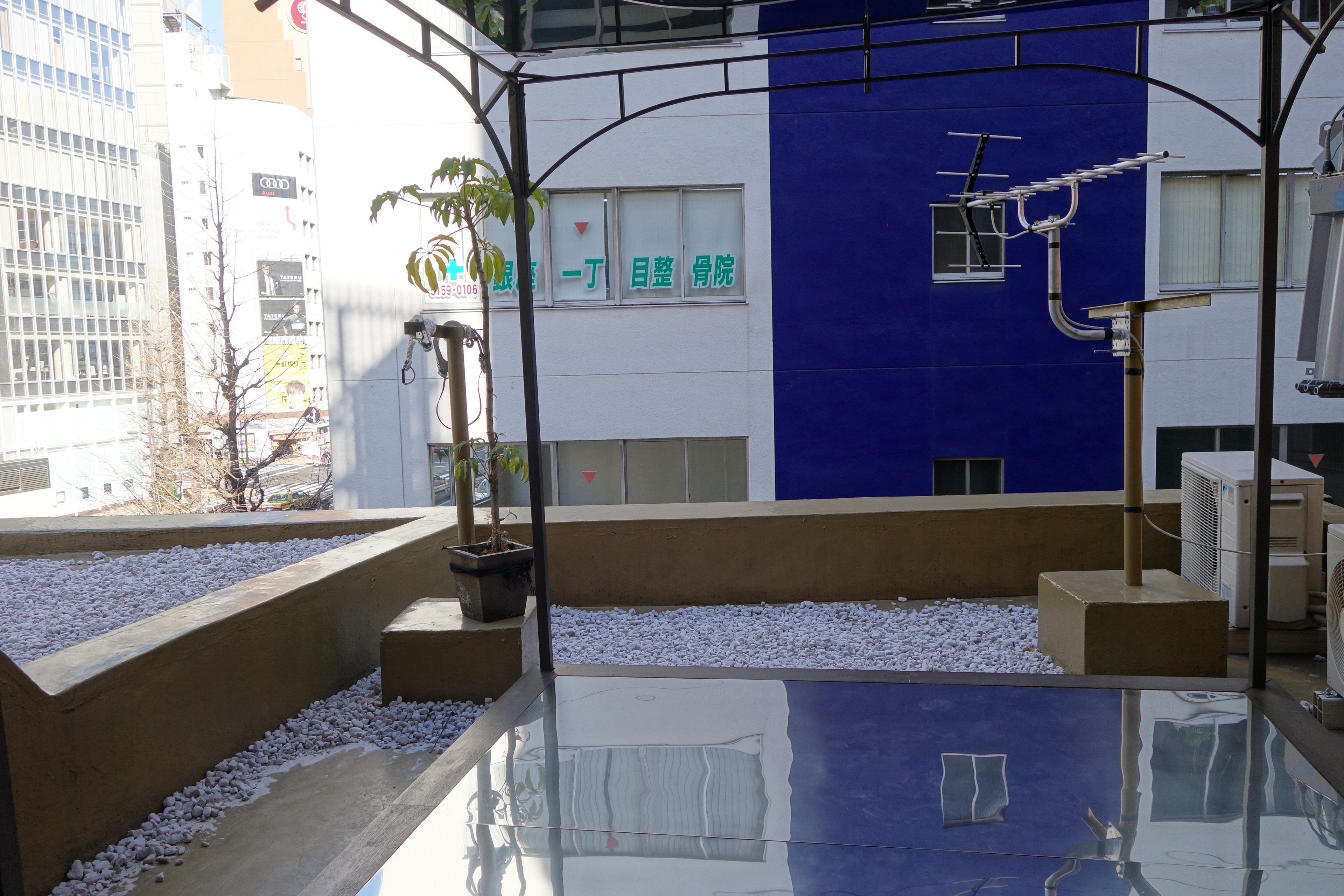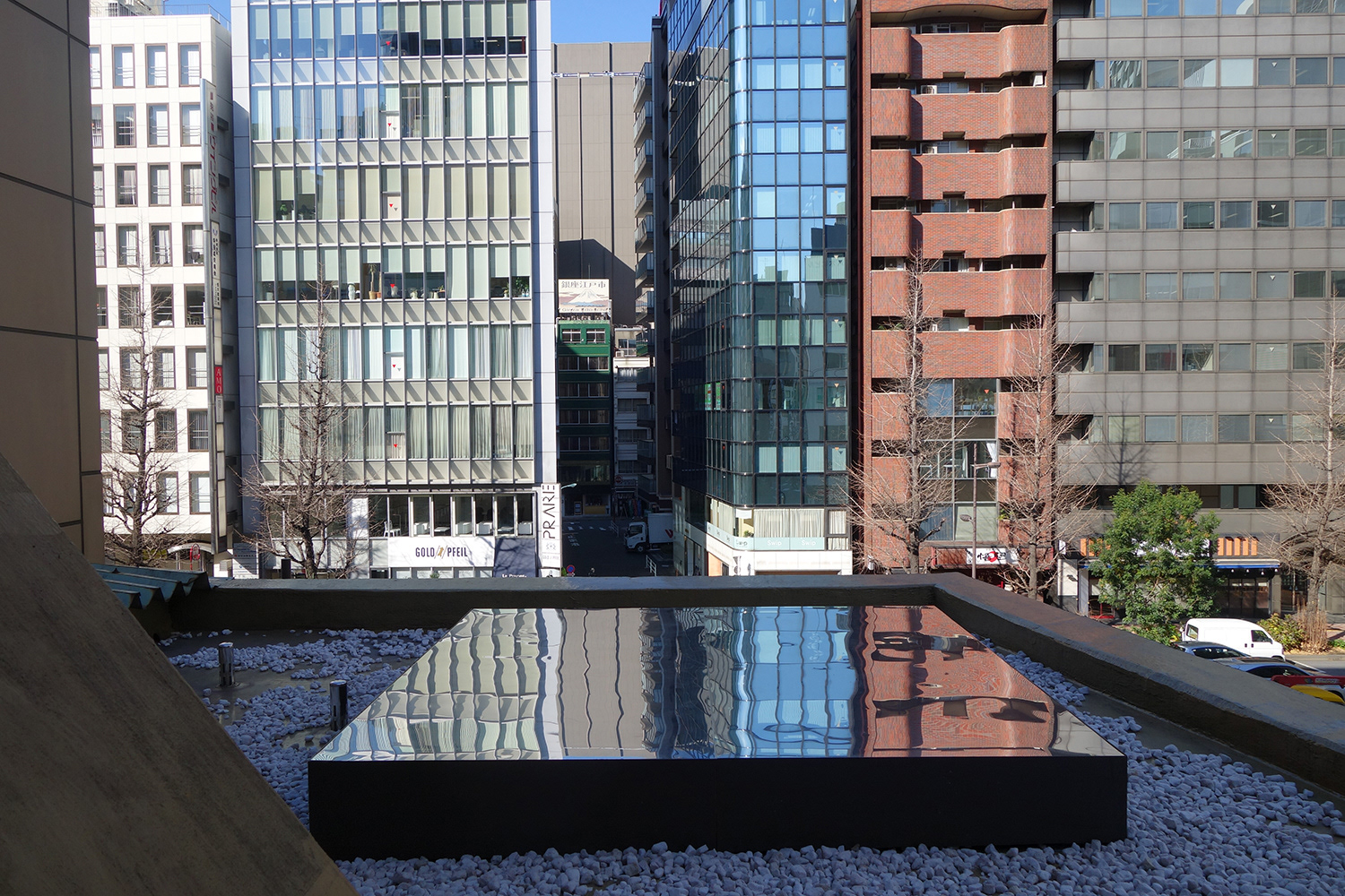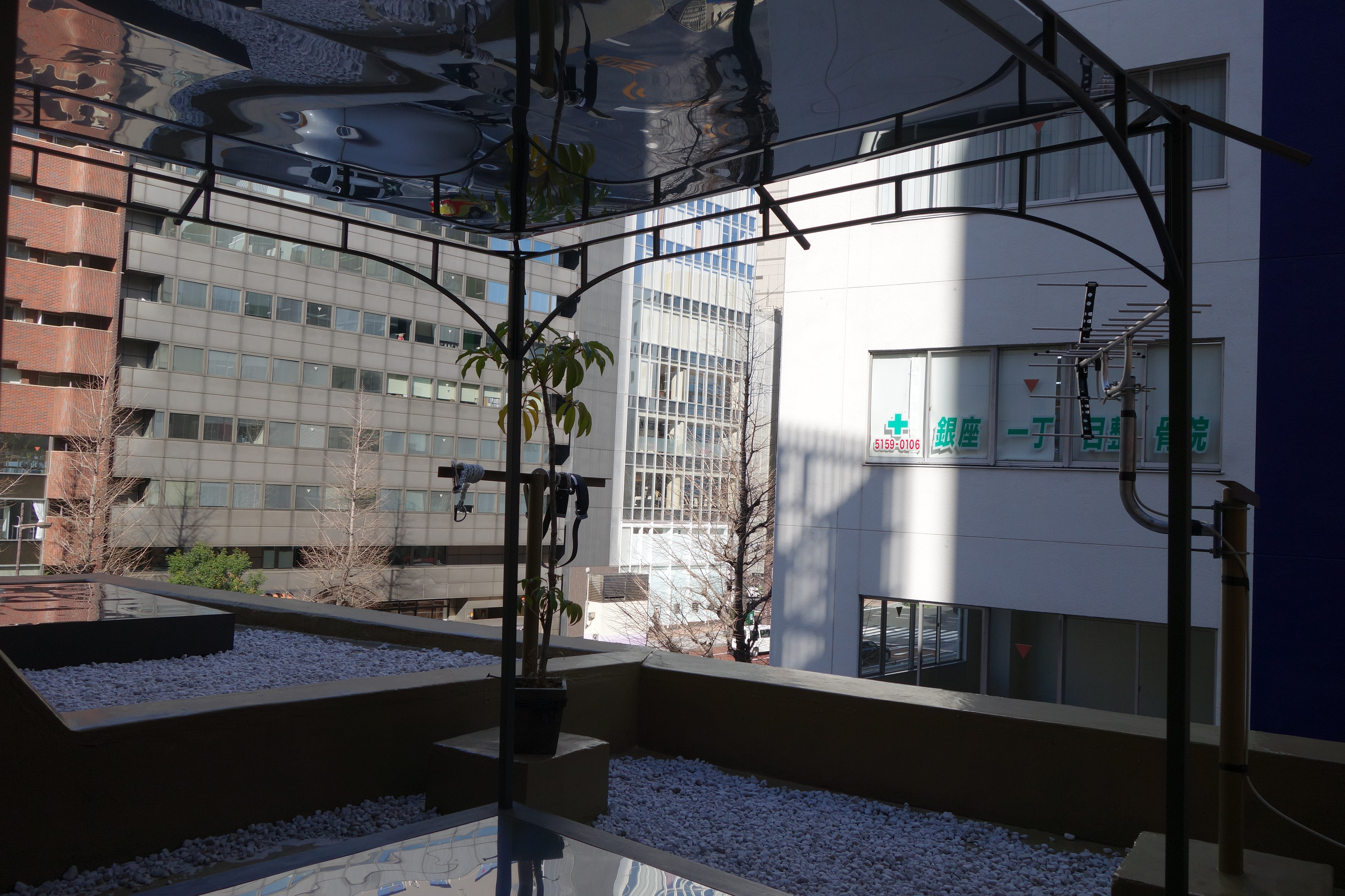 展覧会の会場となったビルは、高層ビルが建ち並ぶ昭和通りの中にあっては珍しい低層ビルで、屋上は、車の行き交う大通りや高層ビルなどの街並みが広がり、見上げれば大きく空を見渡す事が出来る場所。まさに銀座の縮図であるかのようなこの場所に、私たちは大きな鏡を設置する事にした。