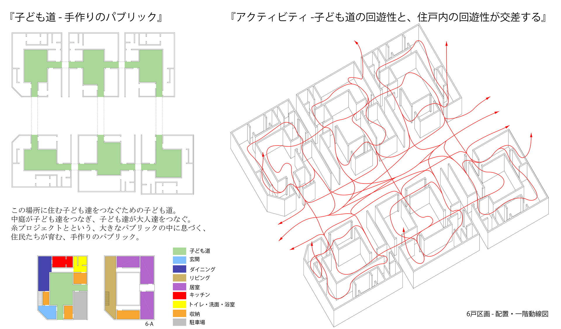 子ども達が日常的に『子ども道』で遊び、それを取り巻くように配置された住戸の中で、親達はその気配を感じとる。