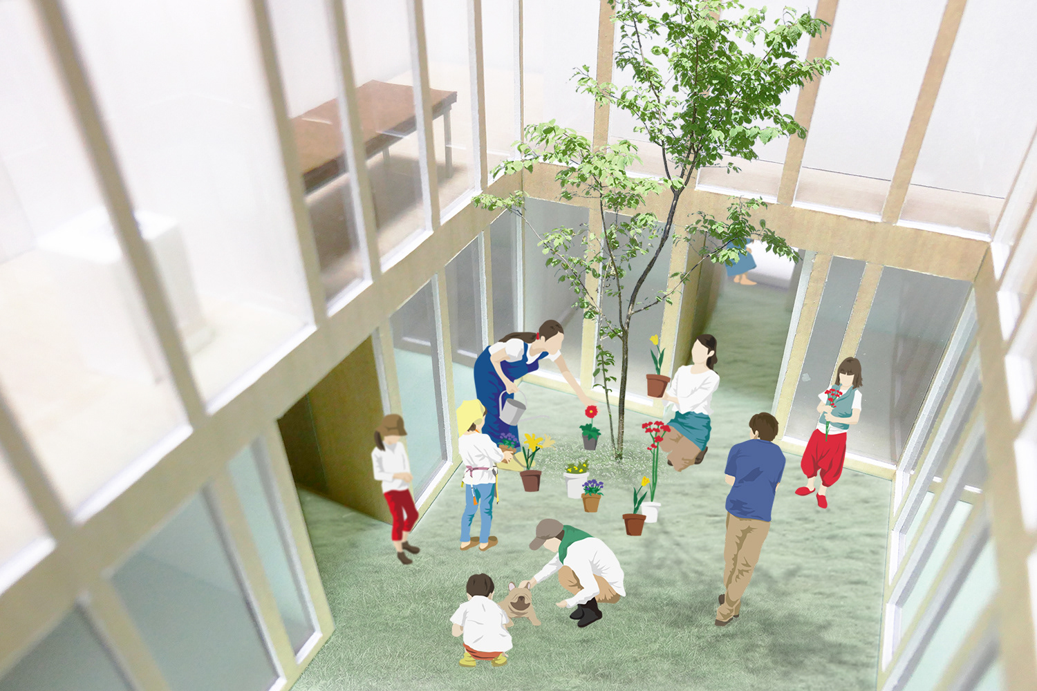 空き地は、隣の住戸と接続されており、住戸群全体で一つの空き地を共有しているかのような構成となっています。