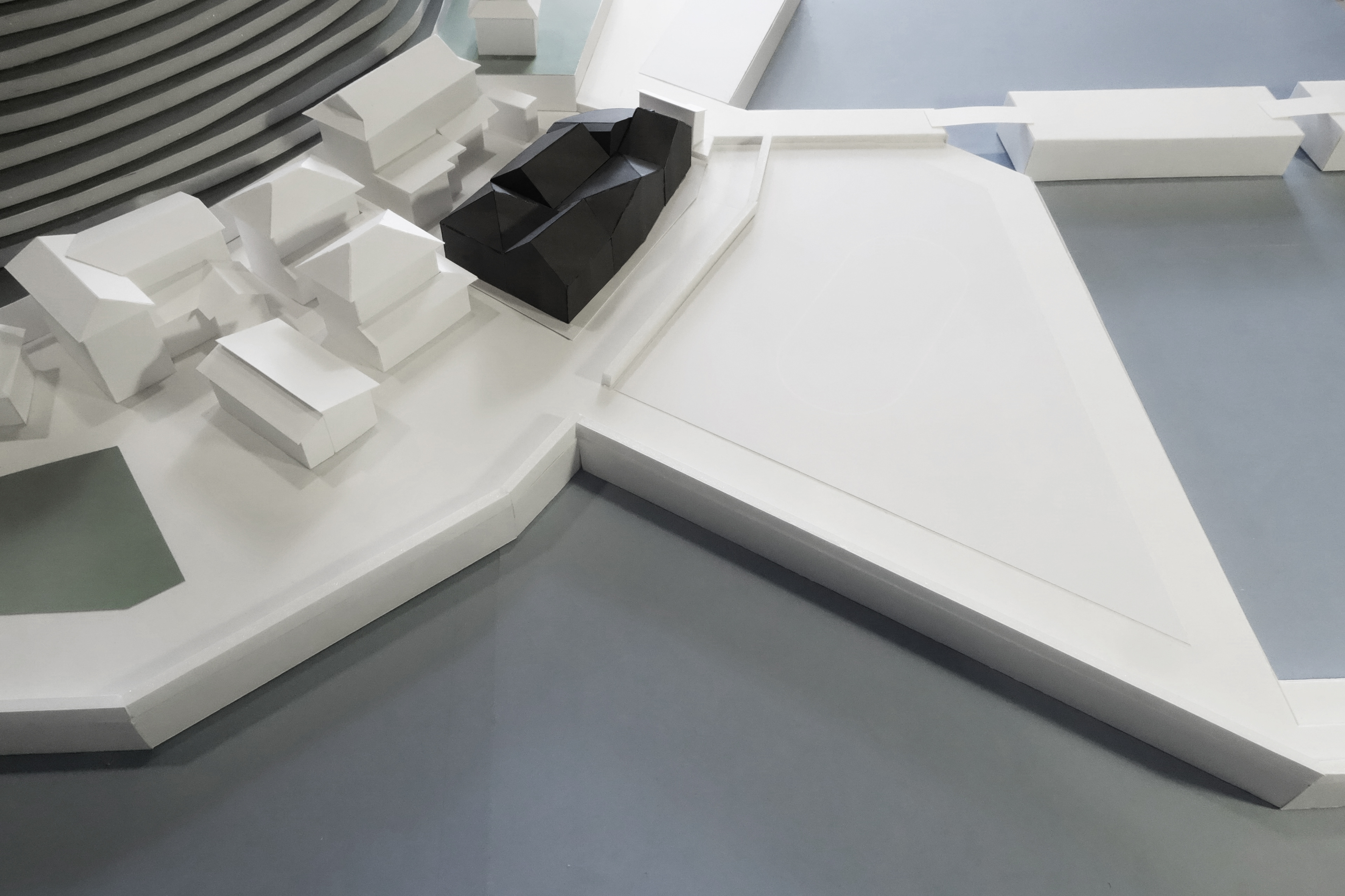 【来訪者と島民の長屋】は、異なる屋根形状を持った6つの小さな家型が互いに寄り添い合い、『長屋』のような形態をとっています。