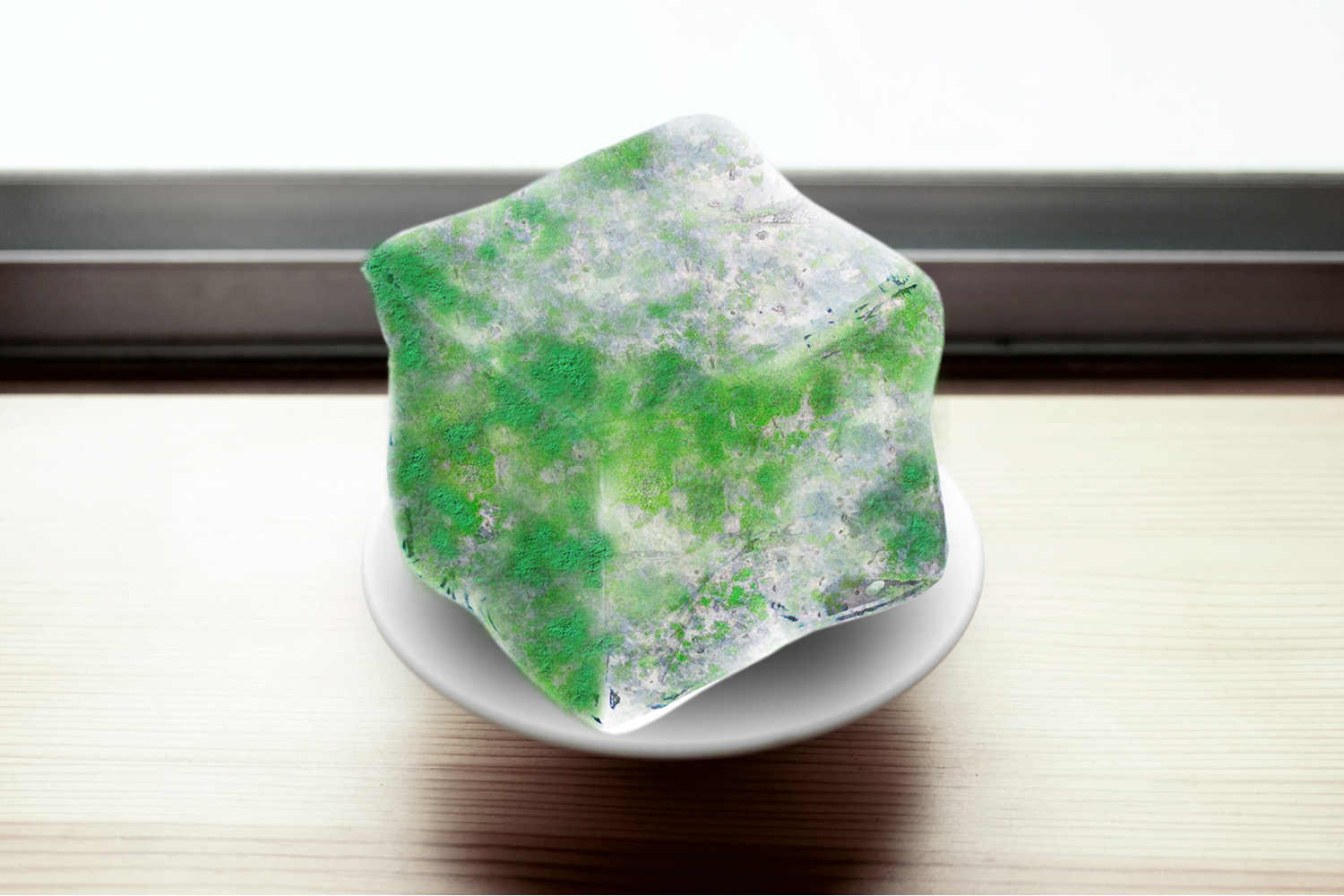 【こけの生えるガラスブロック】は、粗く作ったガラスブロックに、透明で土の代わりにもなる合成ポリマーを塗り込み、弾性の高いビニルシートでラッピングする事で生まれます。