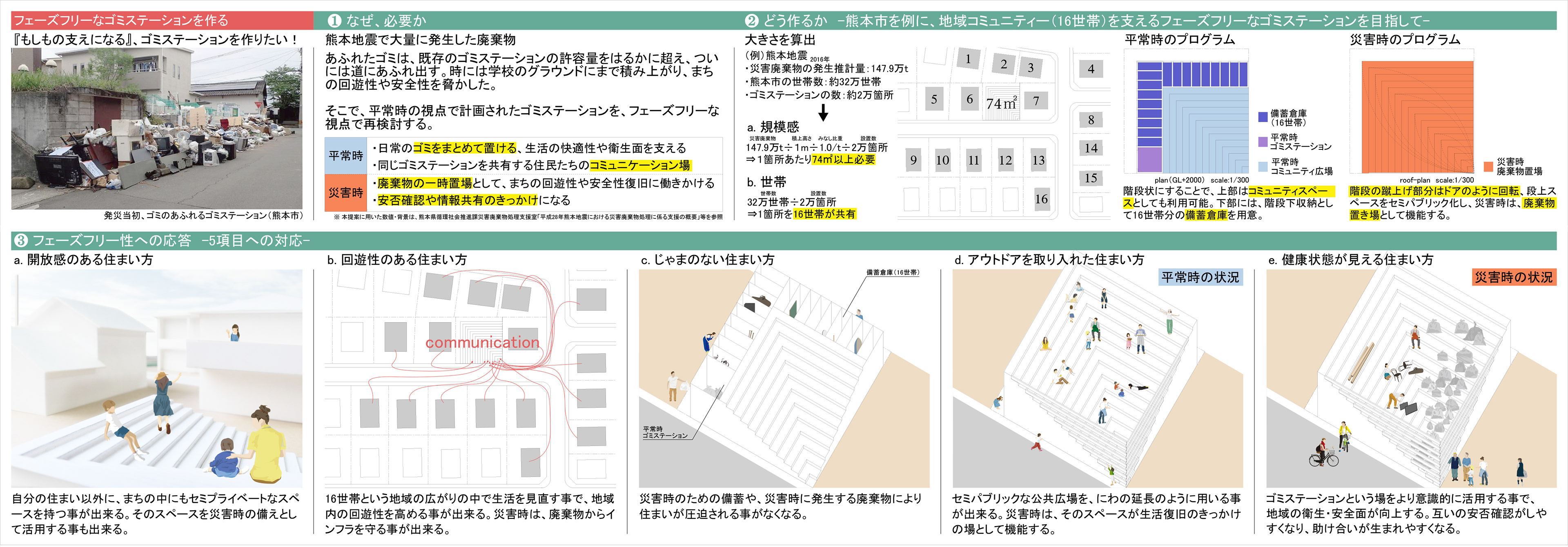 【フェーズフリーなゴミステーション】は、熊本地震時、廃棄物であふれたゴミステーションや校庭、路上の姿に着想を得ています。熊本地震のデータを参照し、災害時にも対応できる規模と、共有する世帯数を算出、結果として得られた74㎡・16世帯を一つのコミュニティ単位として定義しました。