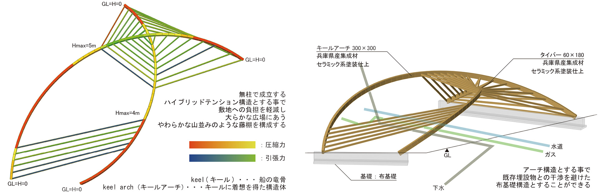 アーチ及びタイバーを構成する部材は、軸力が支配的となるため、 木材の繊維方向の強度特性を生かして、兵庫県産材を利用した 集成材とする。恒久的な屋外の木材利用となることから、セラミック系塗料等を 用いて、防火、防水性能を付与すると共に、定期的なメンテナンス 計画を作成し、長期的な耐久性を確保する。基礎は既存埋設物との干渉を考慮して、各埋設物に対して 並行的に、かつ、最小限の基礎形状となるようにキールアーチの 脚部を繋ぐ布基礎としている。