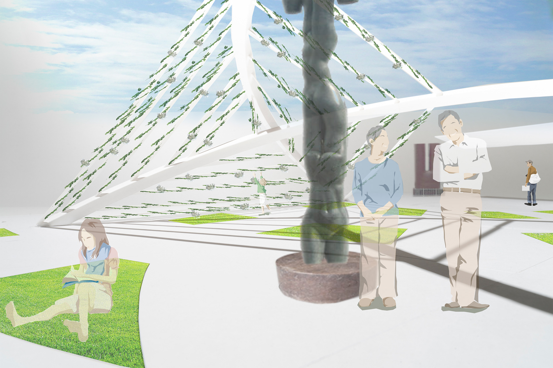 地場産の集成材で作るアーチを、神戸市の市章の形に併せて交差されることで、全方位に対して特色のある、山並みのような造形とした。また、タイバーにはツル性の植物を巻き付け、山を感じる自然ゾーンの一部として、植物に親しみ、芝に座ったり、アーチに寄りかかってみたり・・・散策を楽しむかのように回遊できる空間とした。