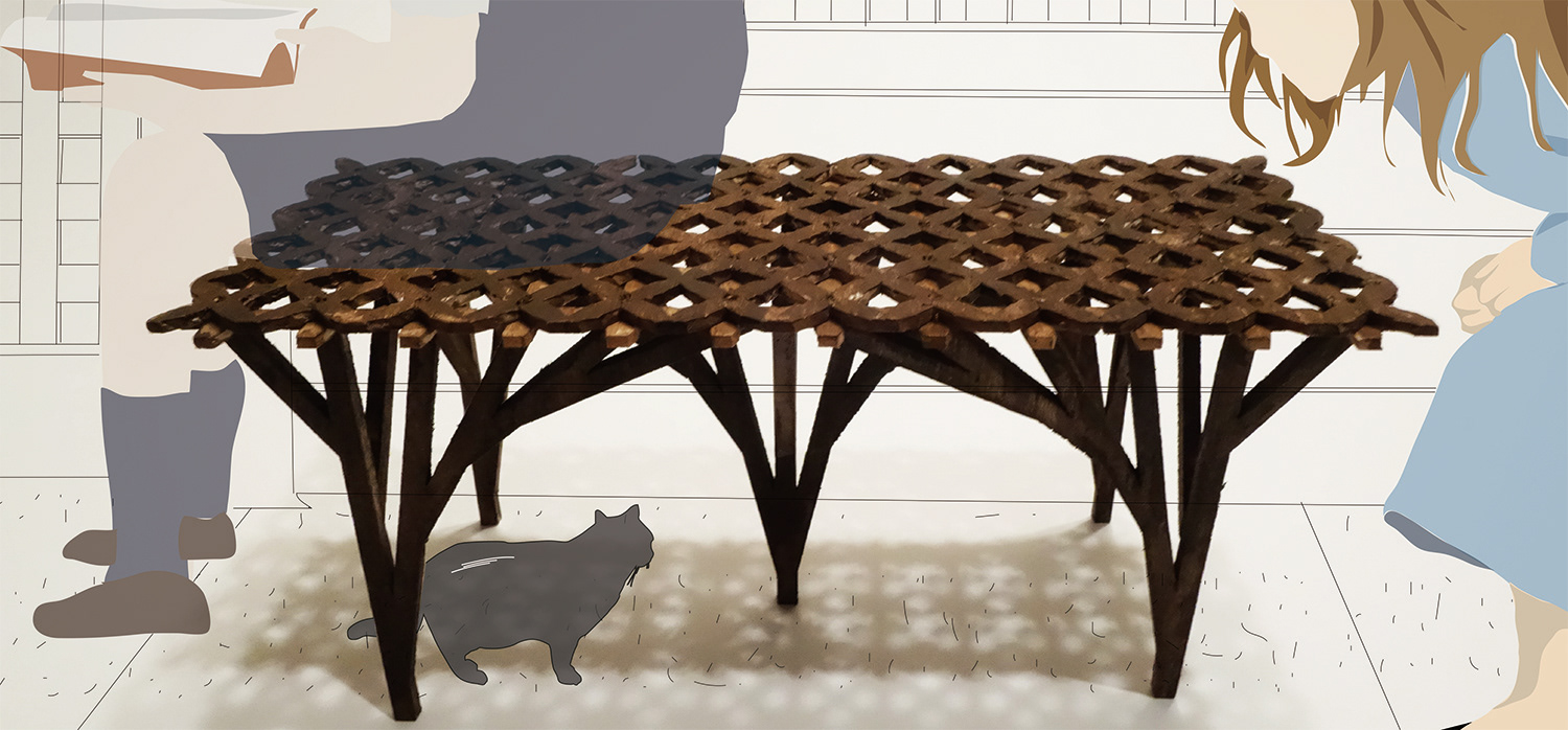 西陣に由来を持つ素材や風景を積極的に用いる事で、 この家具が、これを利用する人々にとっての共通言語になり得るのではいかと考えた。路地の風景、西陣織、坪庭・・・体感を通じて認識されるキーワードが、 会話や交流、西陣により深い愛着を抱くきっかけを生み出す。西陣が育んだ時間で作った家具が、未来の西陣の時間を育む・・・提案を通じて、そんなストリートファニチャーの在り方を目指した。