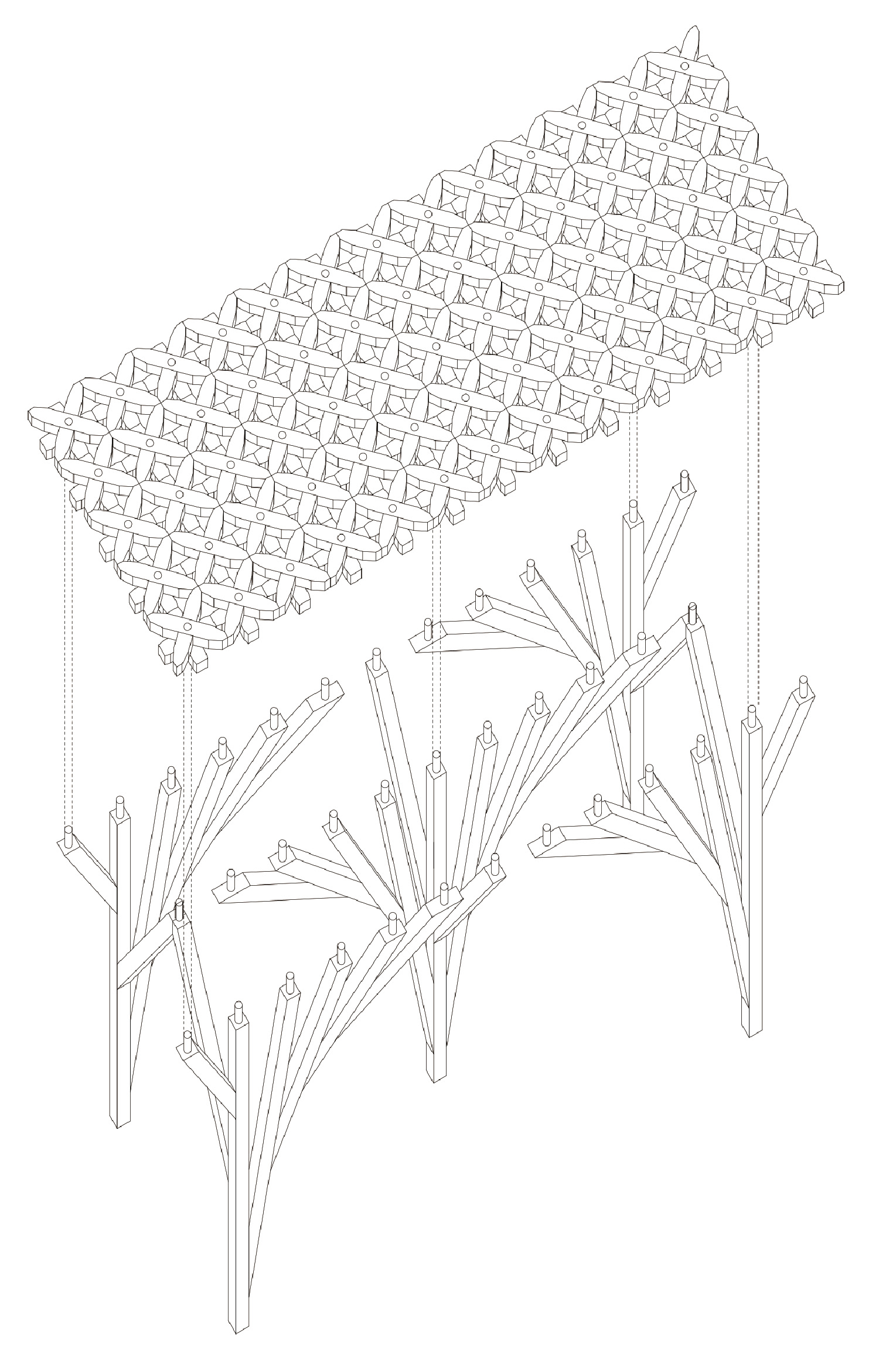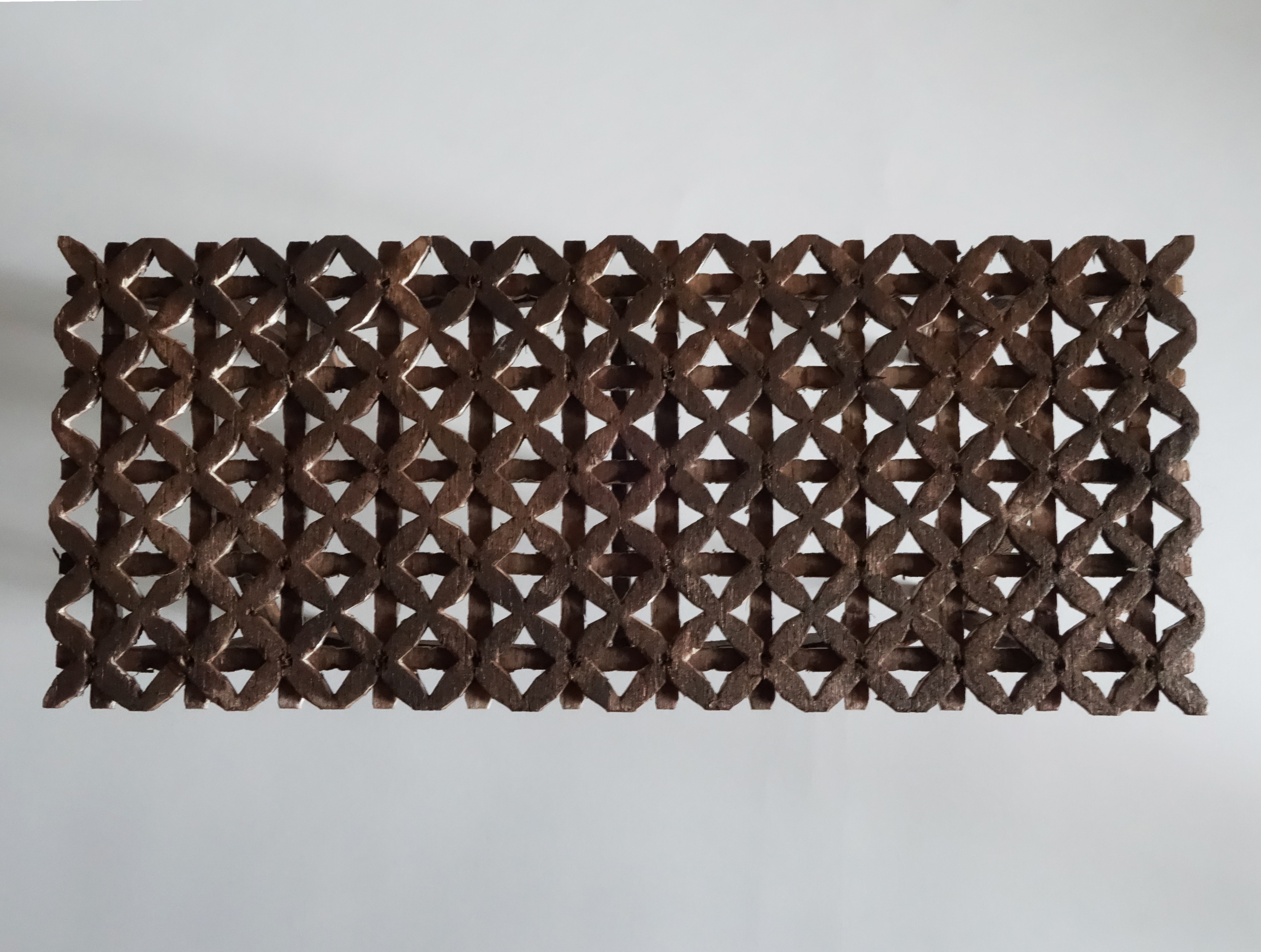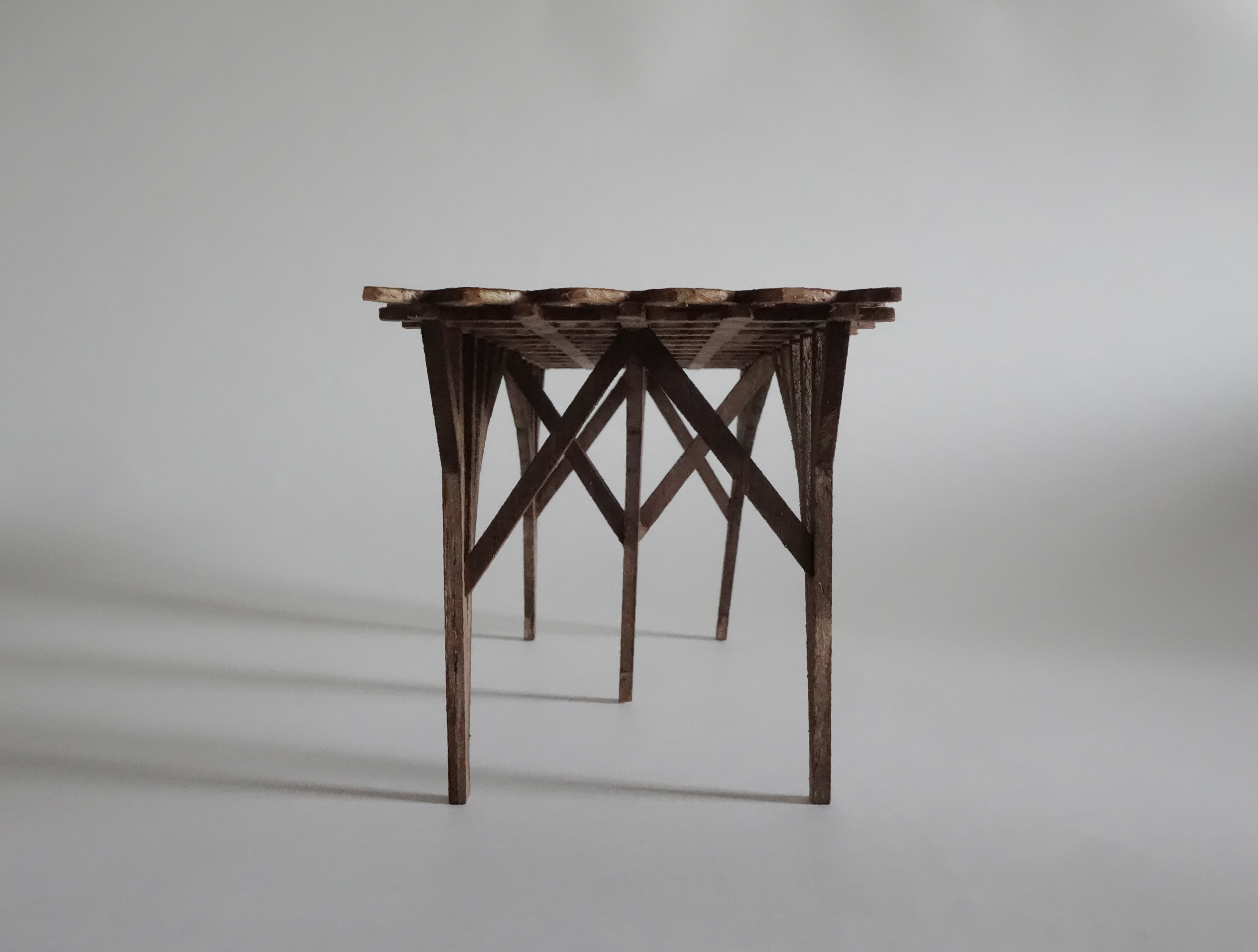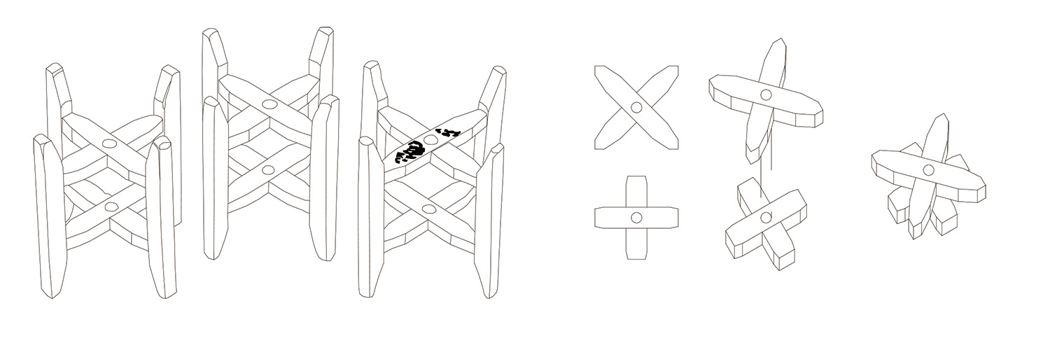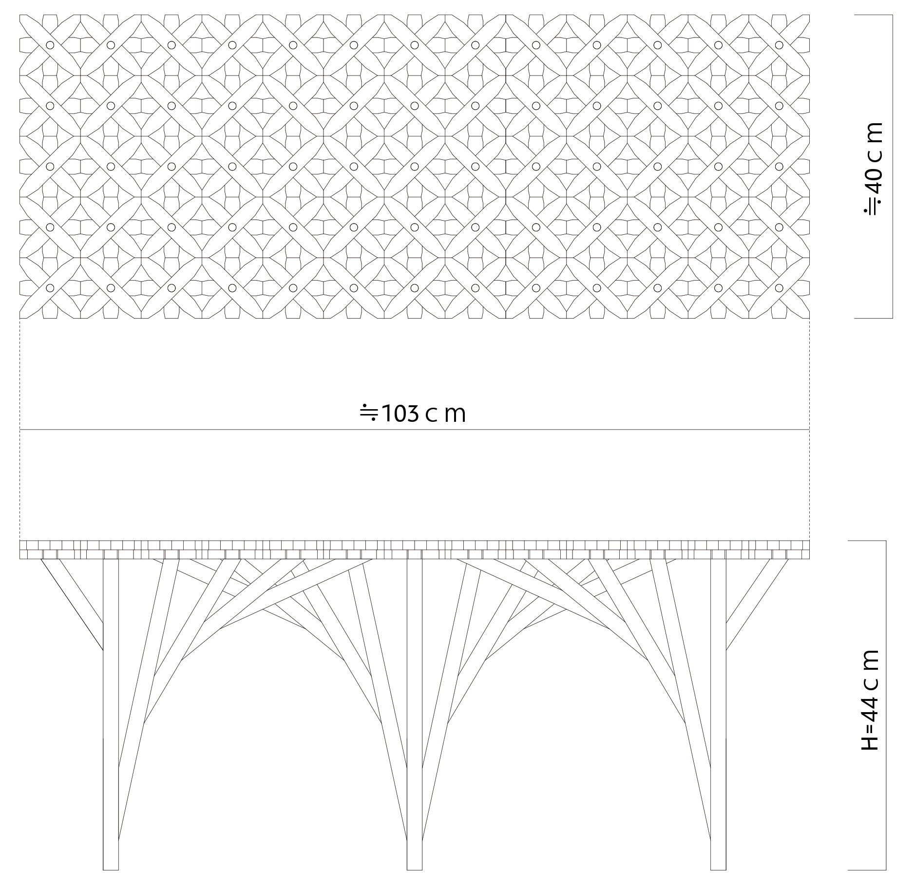 また座面を支える縁台の脚には、樹状構造を採用した。小さなピースの組み合わせで作られる座面は、幅広い支えを持つ事でより安定する。樹状構造が持つたくさん枝は、部材を細くすっきりと保ちながら、その課題を解決する。さらに縁台下の空間を、京の坪庭に見立てた表現とする事で、 縁台は、より西陣との親和性を強めた造形となる。