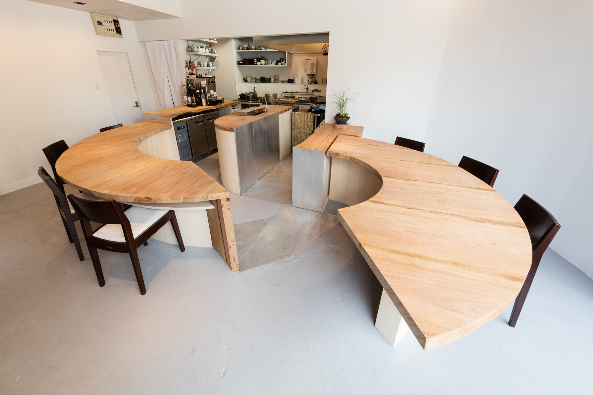 「京で学んだ技と味を、地元の人たちに堪能してもらいたい」そんな料理人の想いを形にしました。丹波産の桜無垢材で作られた大きなカウンターは、料理人の舞台でもあります。