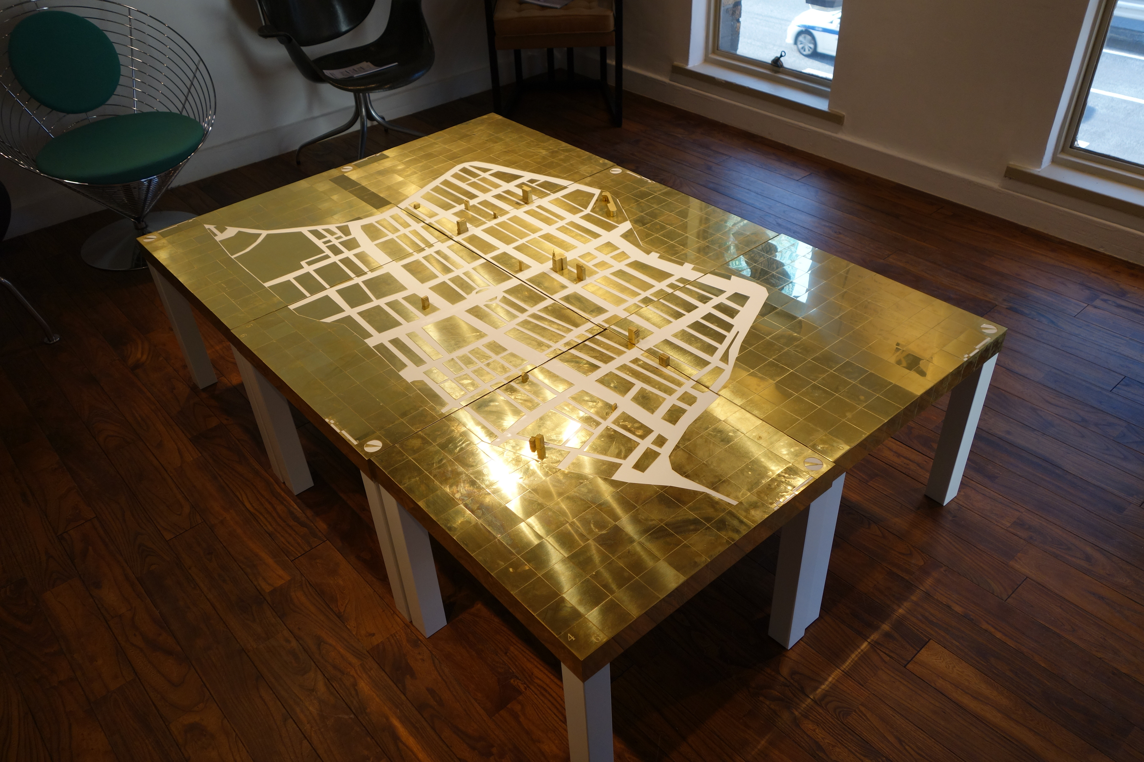 3階、談話室に設置されたテーブルには、ステンレス板を集積して作った「テーブルクロス」をかけました。ステンレスは、首都高速を輪郭に切り取られた銀座の街区が映し出されます。